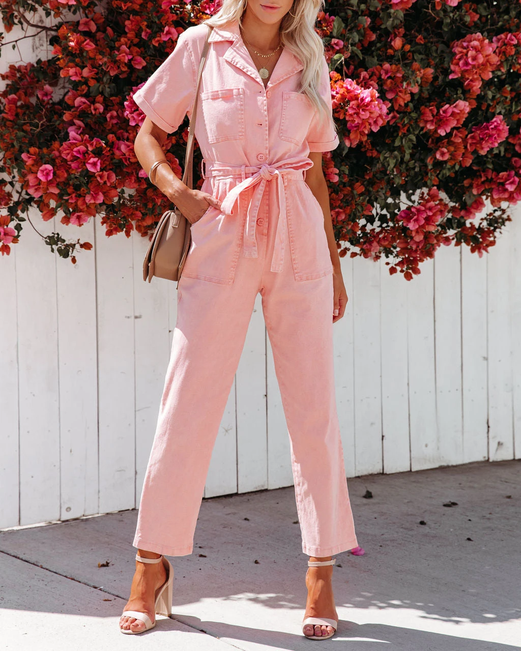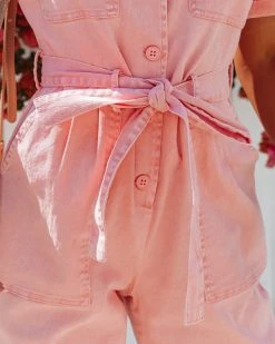 //Best Seller// New Color// Embrace utilitarian style in the Dumbo Cotton Pocketed Denim Jumpsuit in a light coral hue with front button closures and sewn cuffed short sleeves.