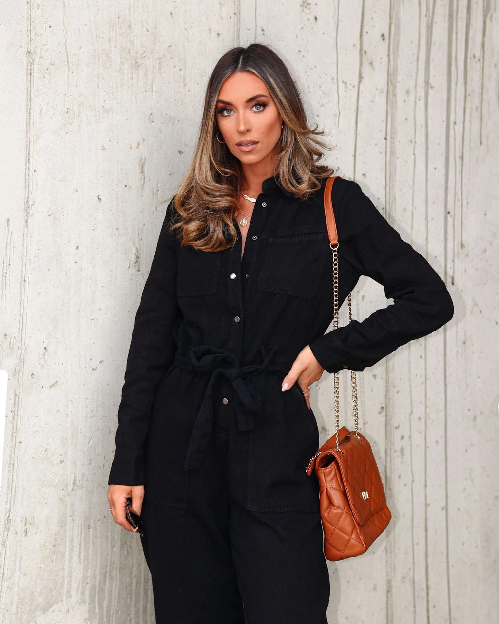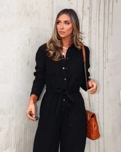 Trendy babes will love the Fiercely Unapologetic Cotton Pocketed Jumpsuit in black that features a waist tie.
