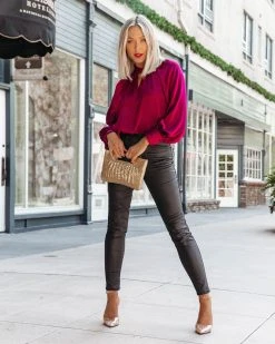 Go from the office to happy hour in the Overall Gratitude Satin Balloon Sleeve Top in wine that features a high neckline.
