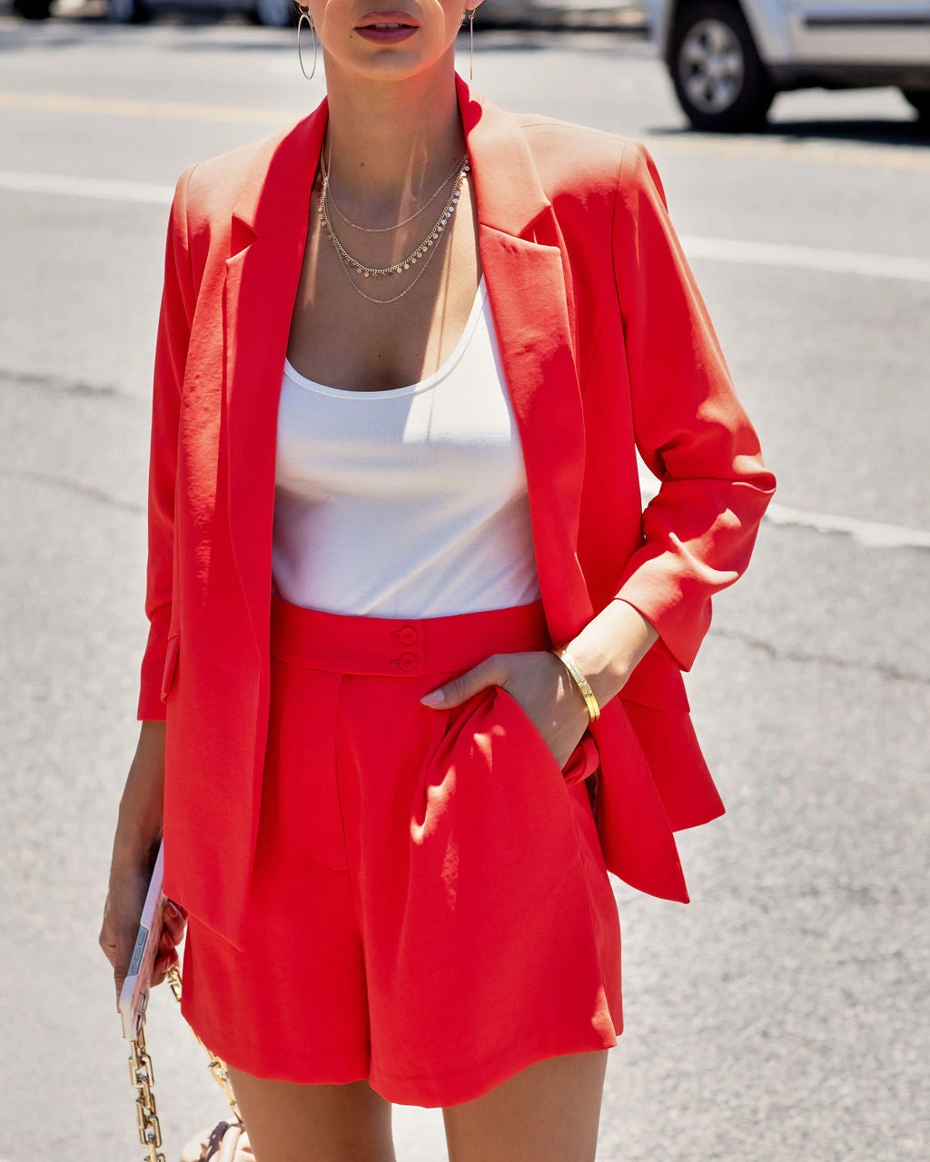 Styled with: Perfect Hoops, Two Tone Necklace, Simple Bangle, Chic Bag, Physique Tank, She Means Business Shorts, and Fantasy Pumps.