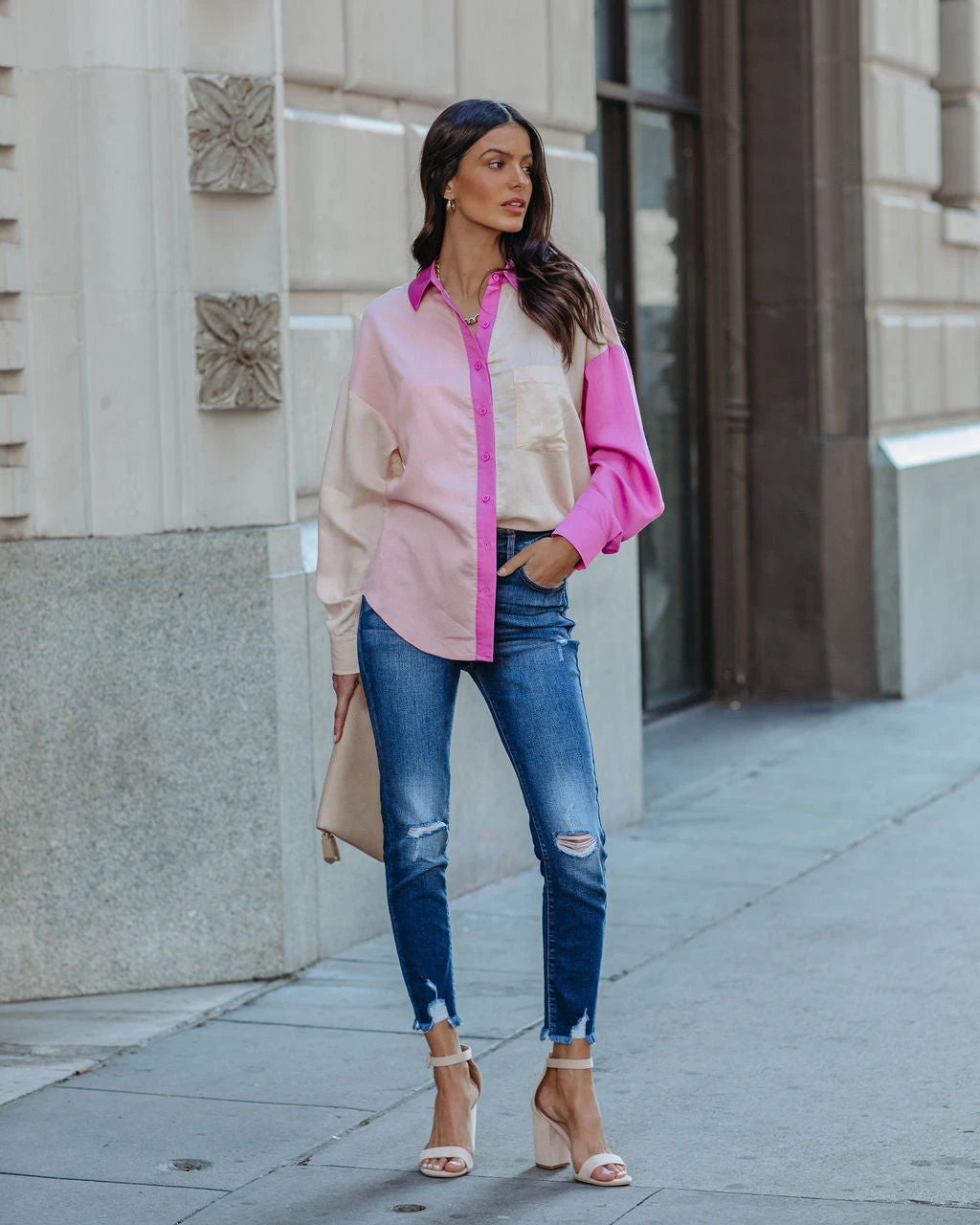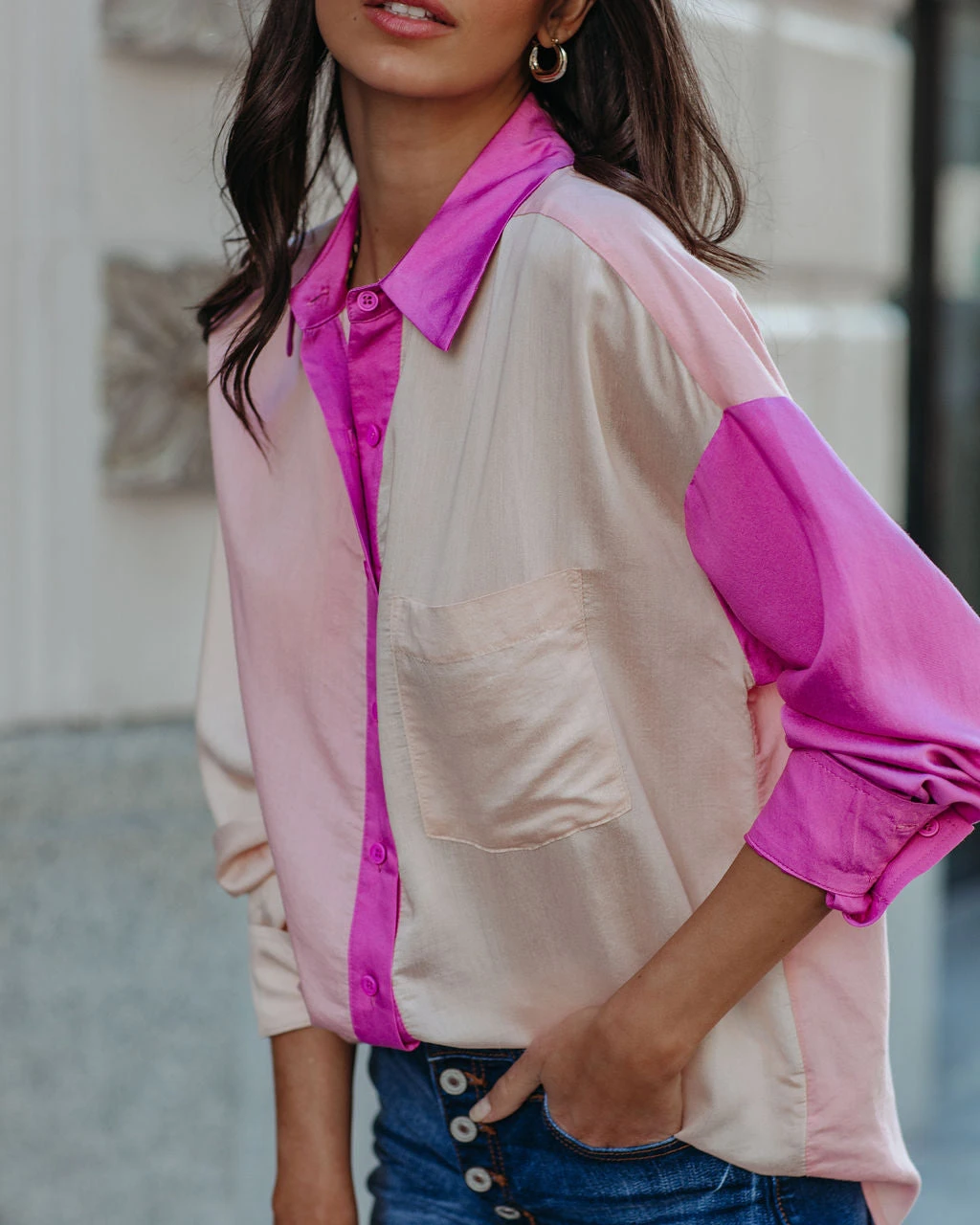 Breeze right from winter to spring in the Belden Colorblock Button Down Top in fuchsia, blush, and light peach colorblock hues with a chic color and a lightweight, gauzy feel.