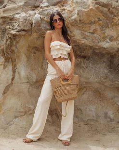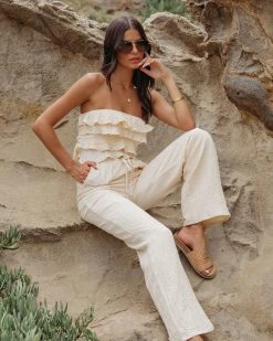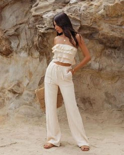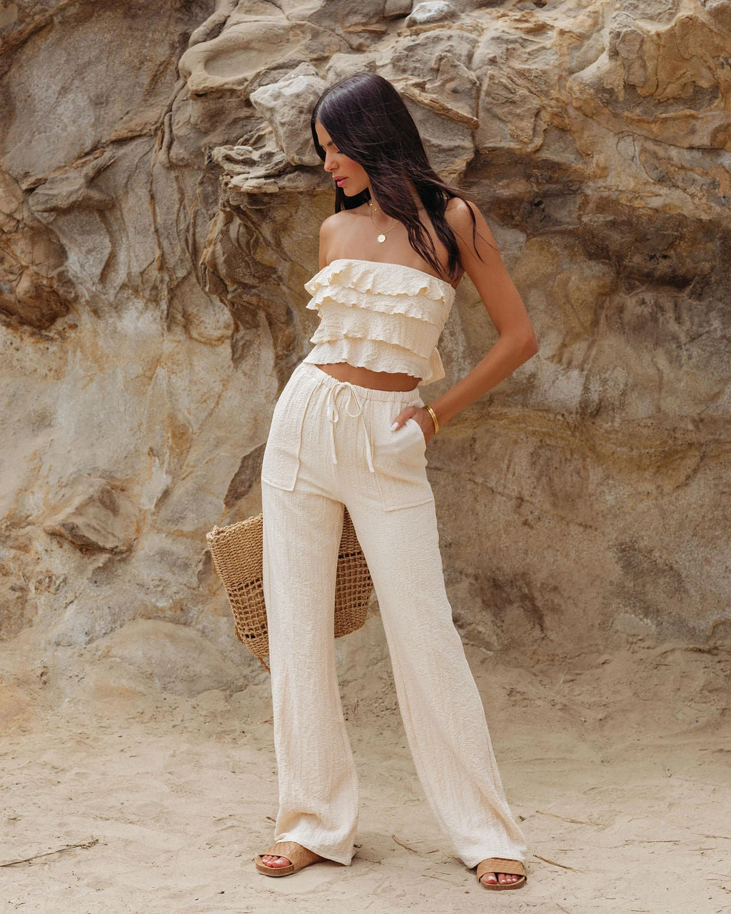 Breezy and beachy, the Canaveral Tiered Strapless Crop Top in cream features a back tie closure.