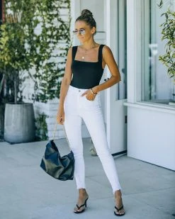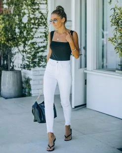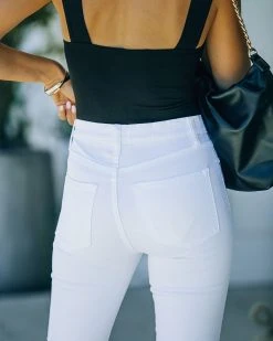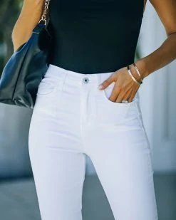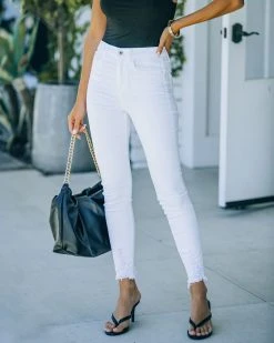 // Sneak Peek// Now is the time to stock up on your white denim! Our Monique High Rise Frayed Ankle Skinny comes in a high rise style in a stretchy fabric. Finished with a classic 5 pocket and a front fly zipper and button closure. Styled with the Chloe Mini Necklace, Compass Coin Necklace, Simple Bangle Bracelet, Elegance Slouchy Chain Handbag, Making Moves Bodysuit, and Misty Faux Leather Heeled Sandal.
