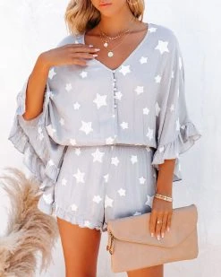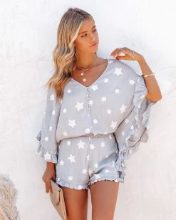 //Best Seller// New Color// Star embroidered everything please! Our Beyond The Sea Embroidered Star Kimono Romper is a grey base with delicate white embroidered stars. Finished with ruffled kimono sleeves, a smocked waist, and a ruffled hem. Styled with the Perfect Hoop Earrings, Chloe Mini Necklace, Elena Pendant Necklace, Compass Coin Necklace, Simple Bangle Bracelet, Stella Crossbody Envelope Zip Clutch, and Whimsy Heel.