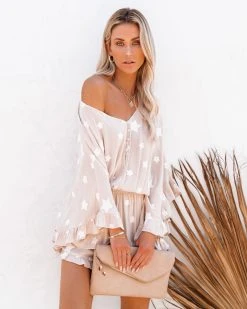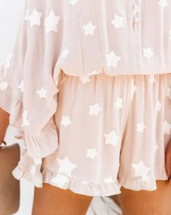 //Best Seller// The Beyond The Sea Embroidered Star Kimono Romper is a sand base with delicate ivory embroidered stars that’s finished with ruffled kimono sleeves and a ruffled hemline.