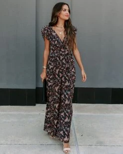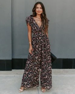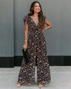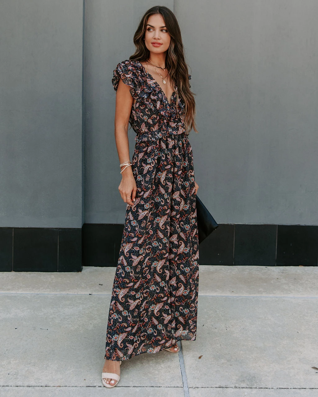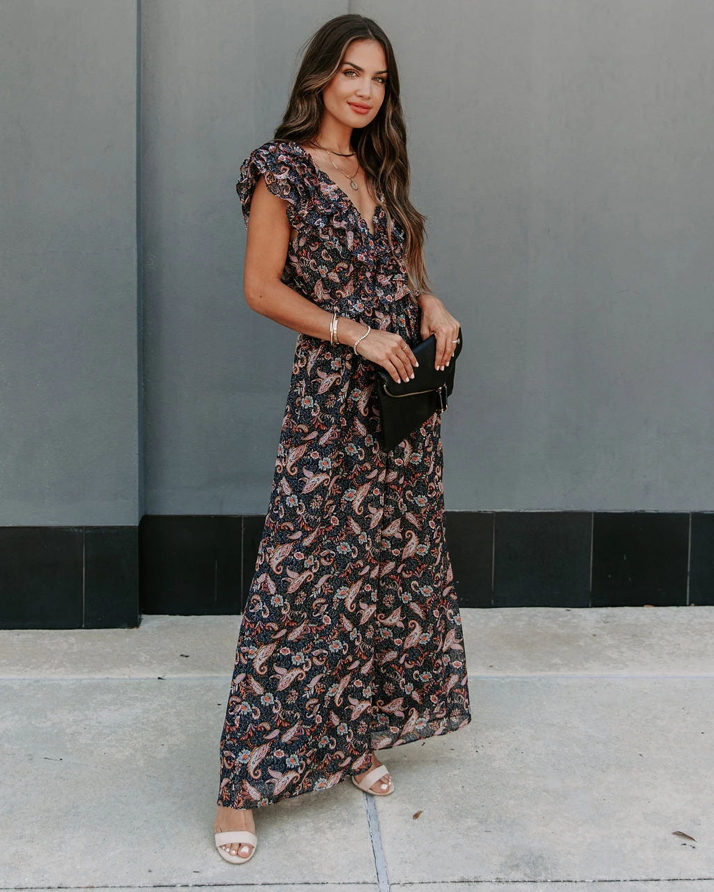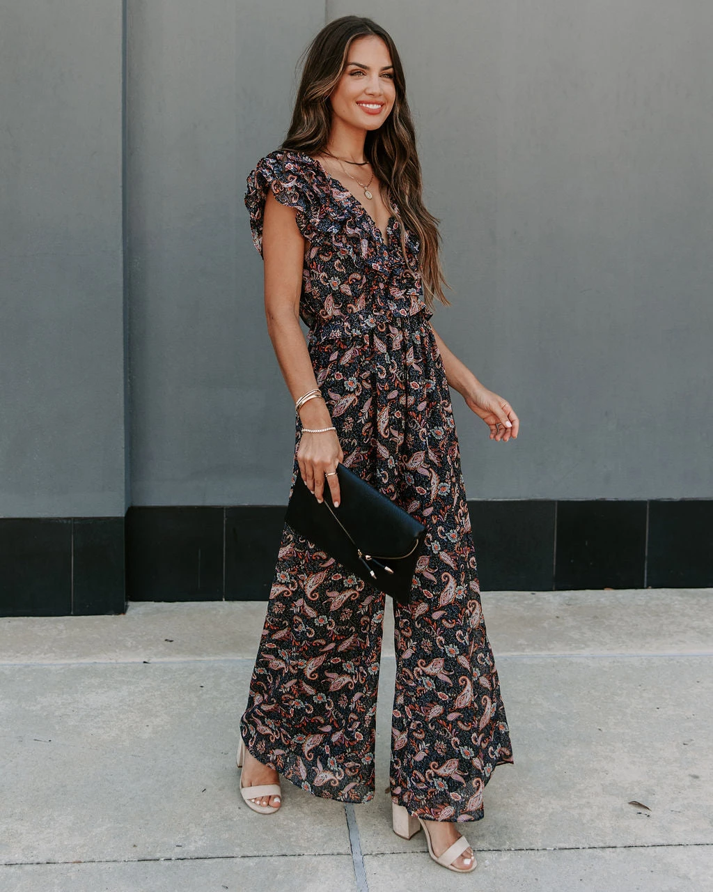 Be the best dressed guest in the Ever Mine Paisley Ruffle Jumpsuit in navy multi that features a ruffle trimming.