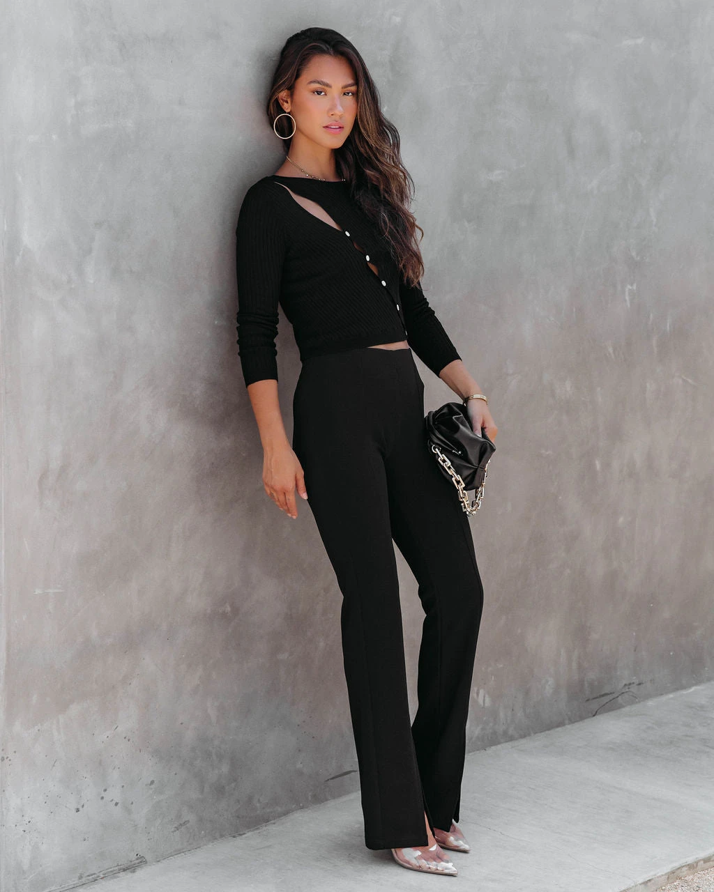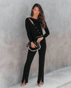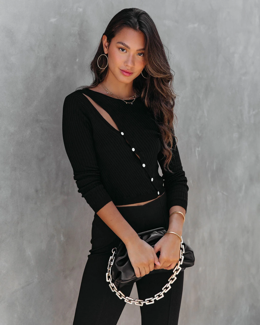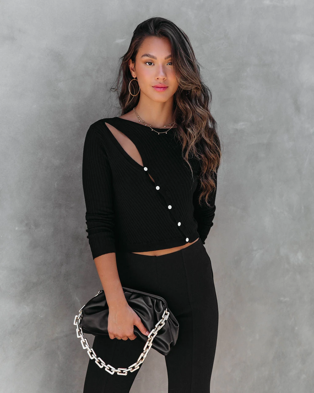 Cute for a night out, the Look At Me Knit Cutout Long Sleeve Top in black features a chest cutout.