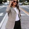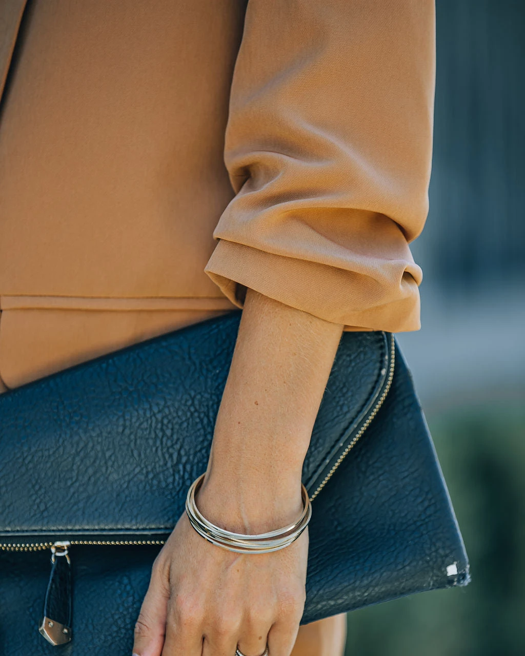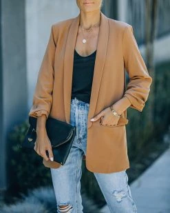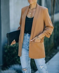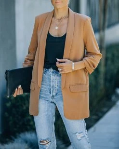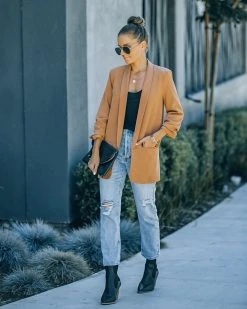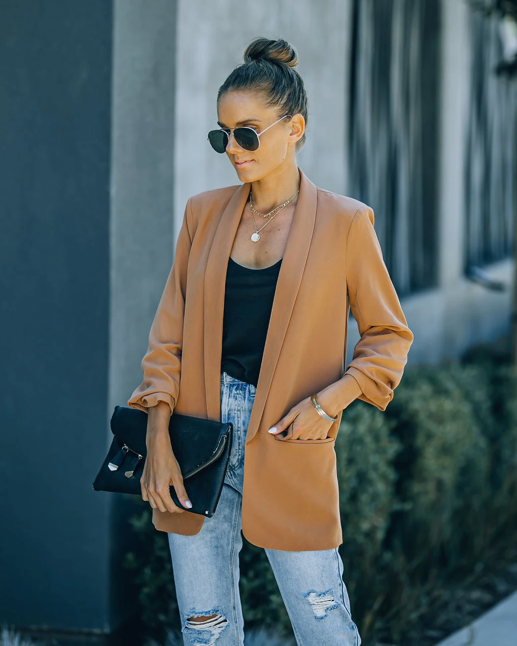 Upgrade your work wardrobe with a bold blazer! Our Entrepreneur Pocketed Blazer comes in a stunning camel. Designed with sewn scrunch sleeves and a fully lined inner. Finished with a lapel collar. Styled with the Chloe Mini Necklace, Compass Coin Necklace, Simple Bangle Bracelet, Stella Crossbody Envelope Zip Clutch, Physique Racerback Tank, Kason Distressed High Rise Denim, and Jocelyn Heeled Bootie.