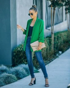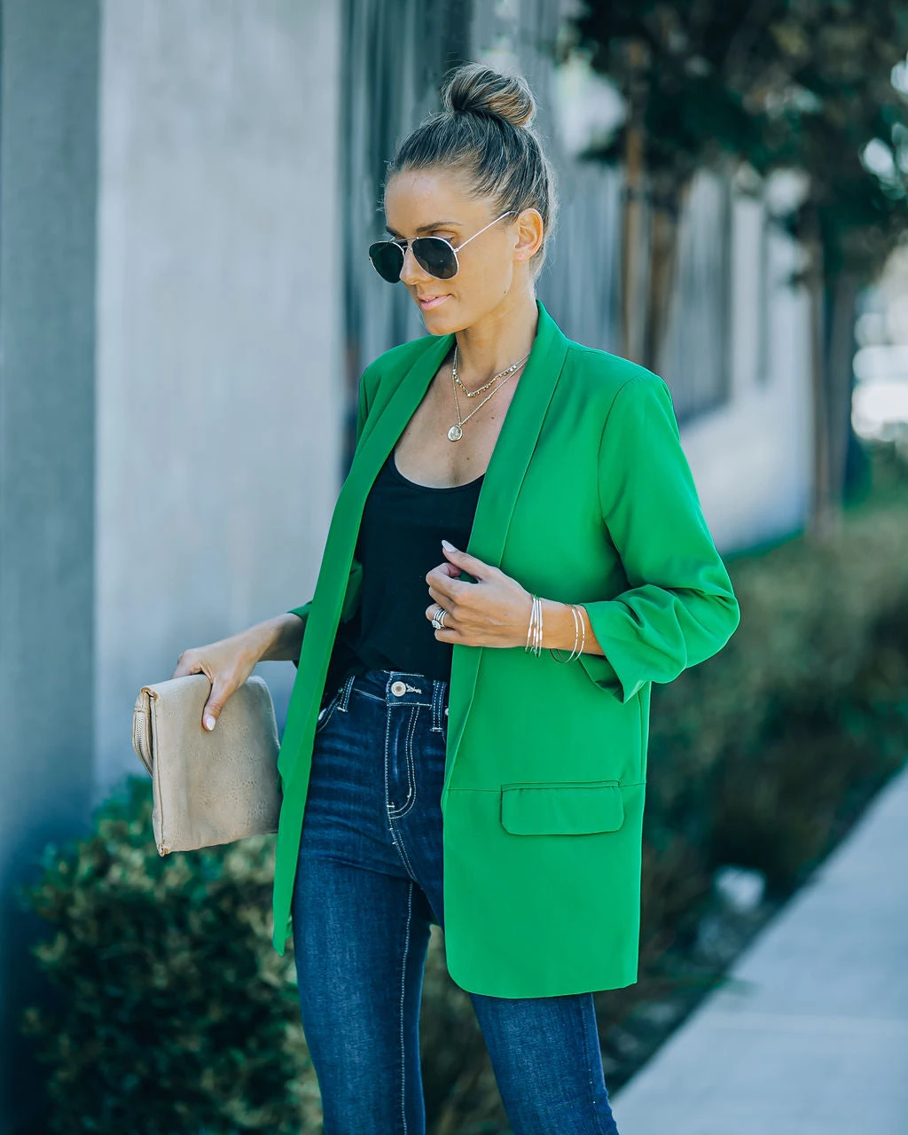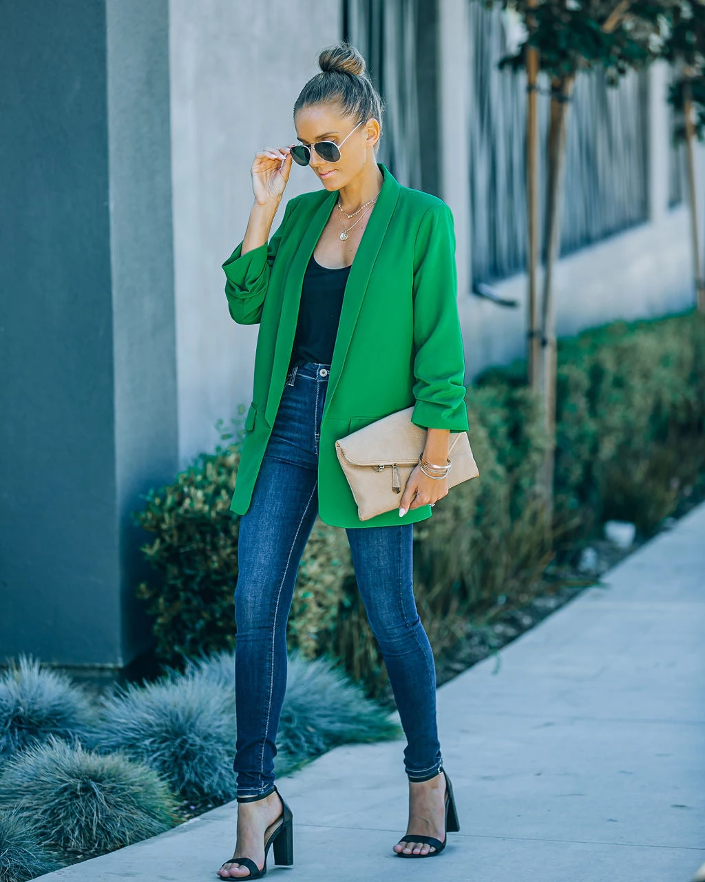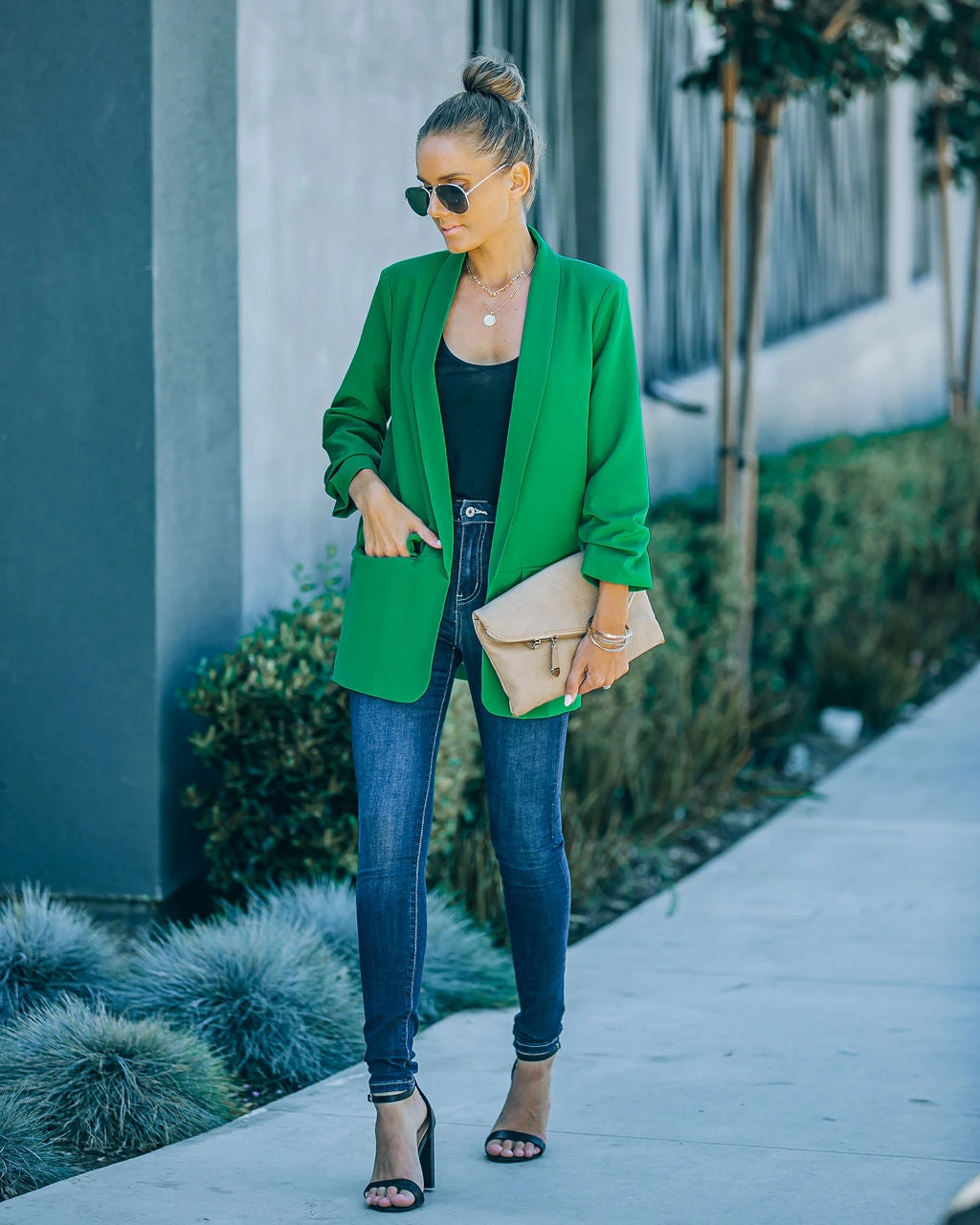 Upgrade your work wardrobe with a bold blazer! Our Entrepreneur Pocketed Blazer comes in a stunning emerald green. Designed with sewn scrunch sleeves and a fully lined inner. Finished with a lapel collar. Styled with the Chloe Mini Necklace, Compass Coin Necklace, Simple Bangle Bracelet, Stella Crossbody Envelope Zip Clutch, Physique Racerback Tank, Daily High Rise Skinny, and Whimsy Heel.