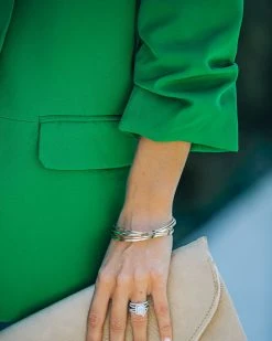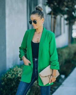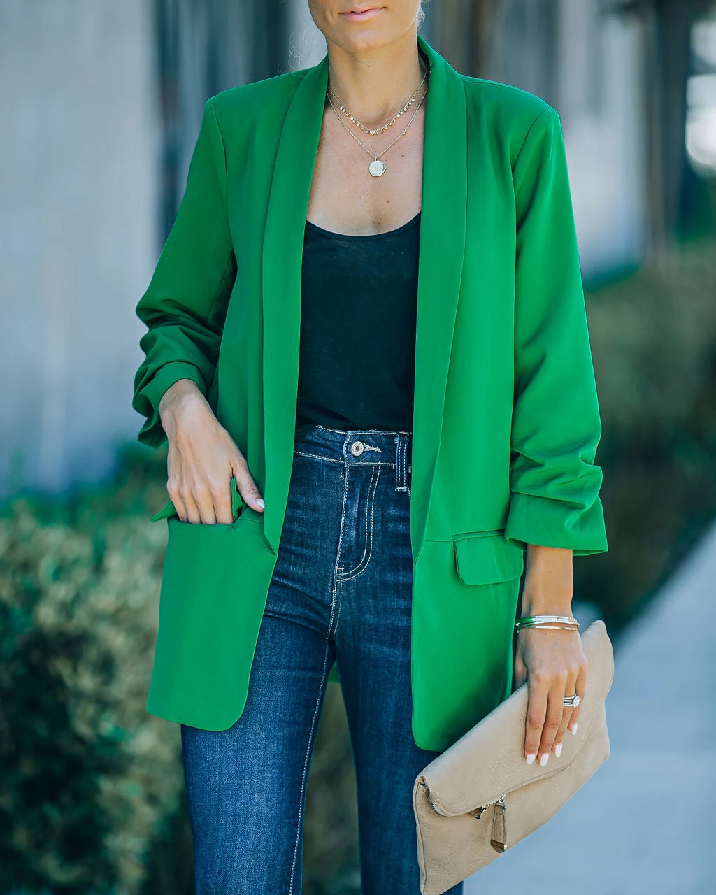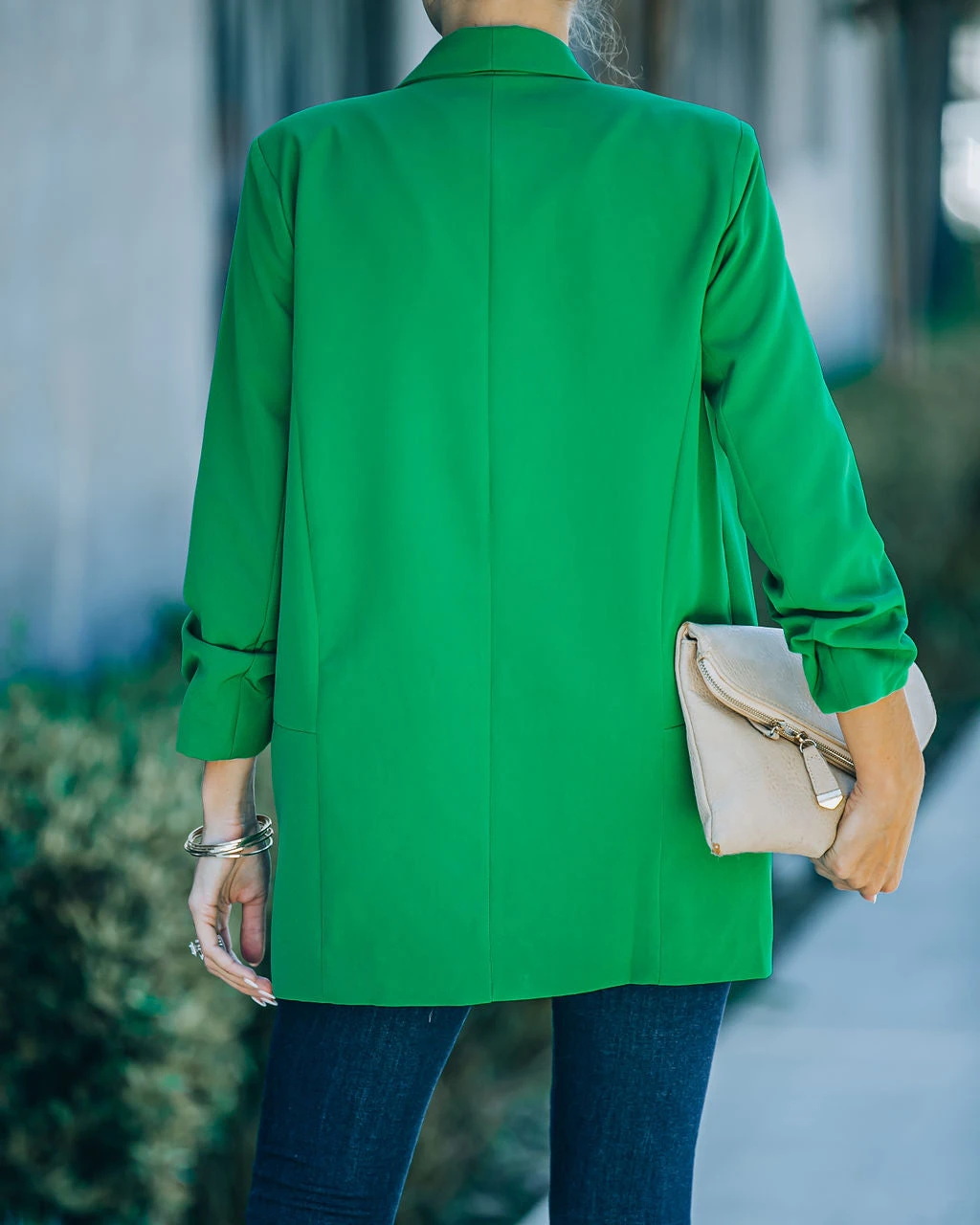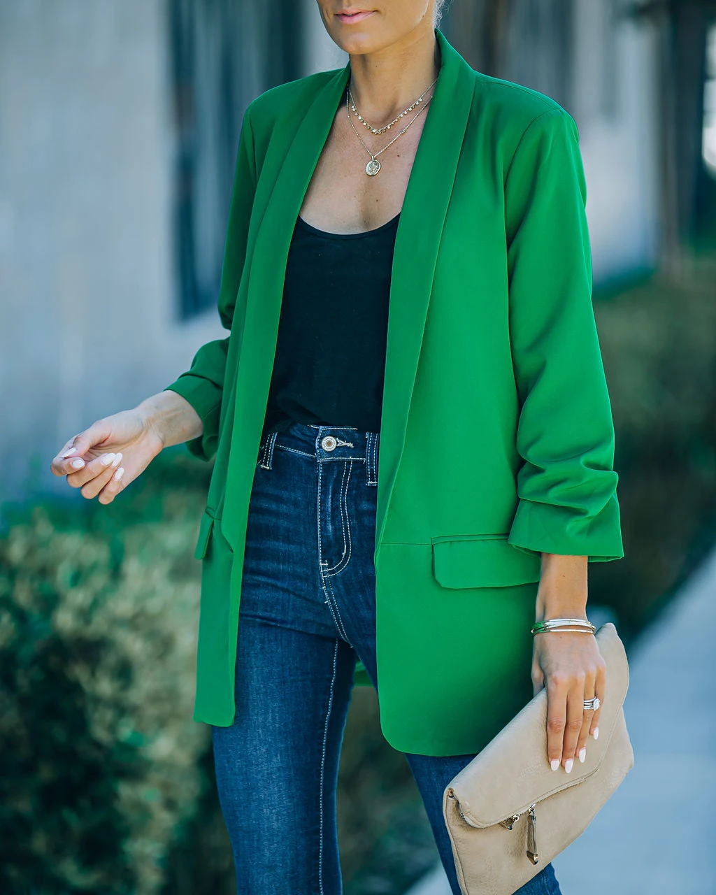 Upgrade your work wardrobe with a bold blazer! Our Entrepreneur Pocketed Blazer comes in a stunning emerald green. Designed with sewn scrunch sleeves and a fully lined inner. Finished with a lapel collar. Styled with the Chloe Mini Necklace, Compass Coin Necklace, Simple Bangle Bracelet, Stella Crossbody Envelope Zip Clutch, Physique Racerback Tank, Daily High Rise Skinny, and Whimsy Heel.