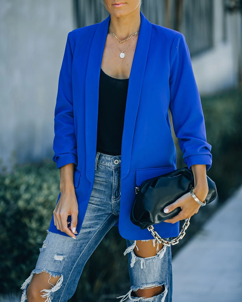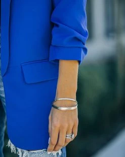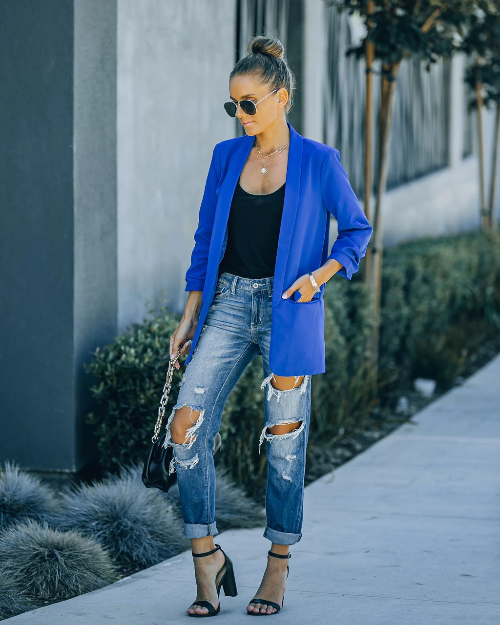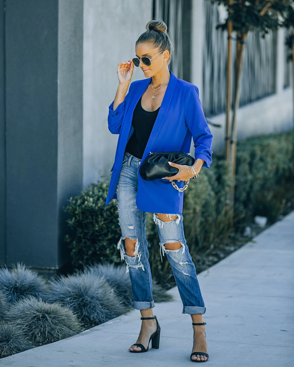 Upgrade your work wardrobe with a bold blazer! Our Entrepreneur Pocketed Blazer comes in a stunning royal blue. Designed with sewn scrunch sleeves and a fully lined inner. Finished with a lapel collar. Styled with the Chloe Mini Necklace, Compass Coin Necklace, Simple Bangle Bracelet, Chic Crossbody Chain Pouch Bag, Physique Racerback Tank, Crawford Boyfriend Denim, and Whimsy Heel.