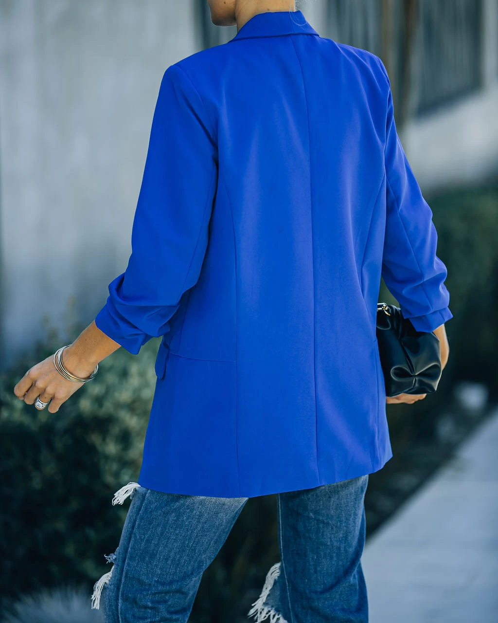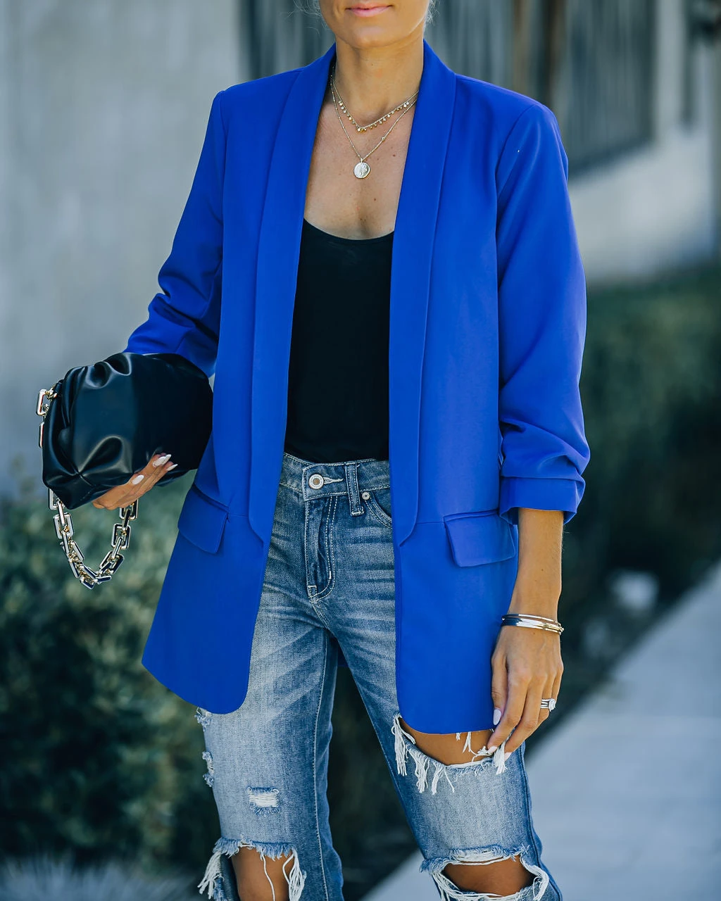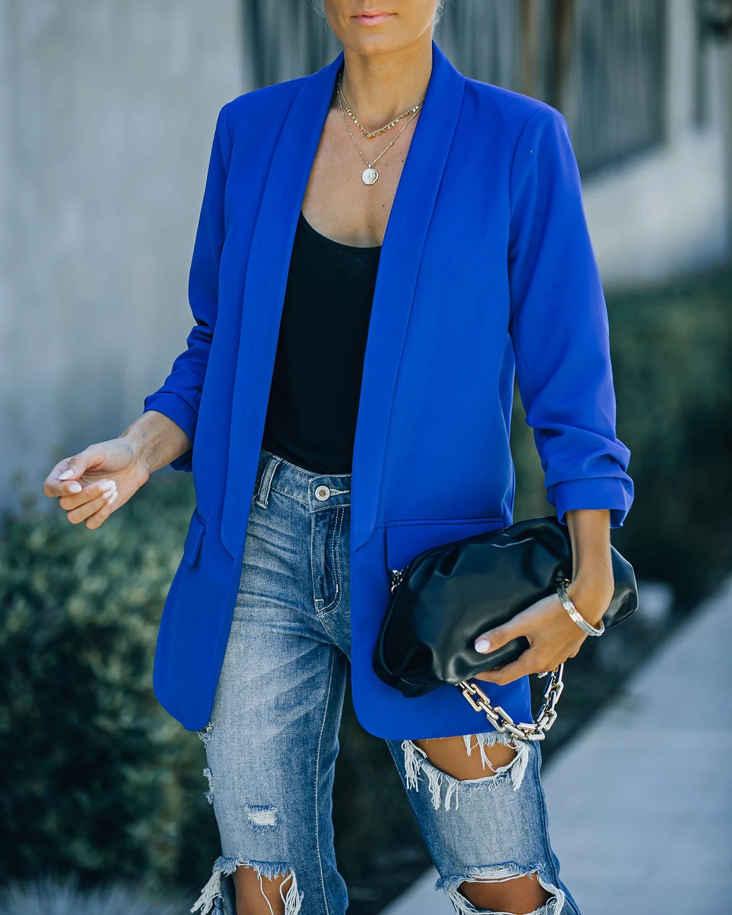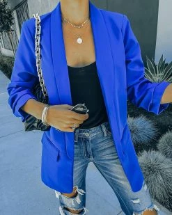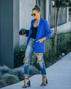 Upgrade your work wardrobe with a bold blazer! Our Entrepreneur Pocketed Blazer comes in a stunning royal blue. Designed with sewn scrunch sleeves and a fully lined inner. Finished with a lapel collar. Styled with the Chloe Mini Necklace, Compass Coin Necklace, Simple Bangle Bracelet, Chic Crossbody Chain Pouch Bag, Physique Racerback Tank, Crawford Boyfriend Denim, and Whimsy Heel.