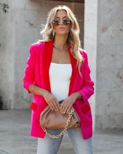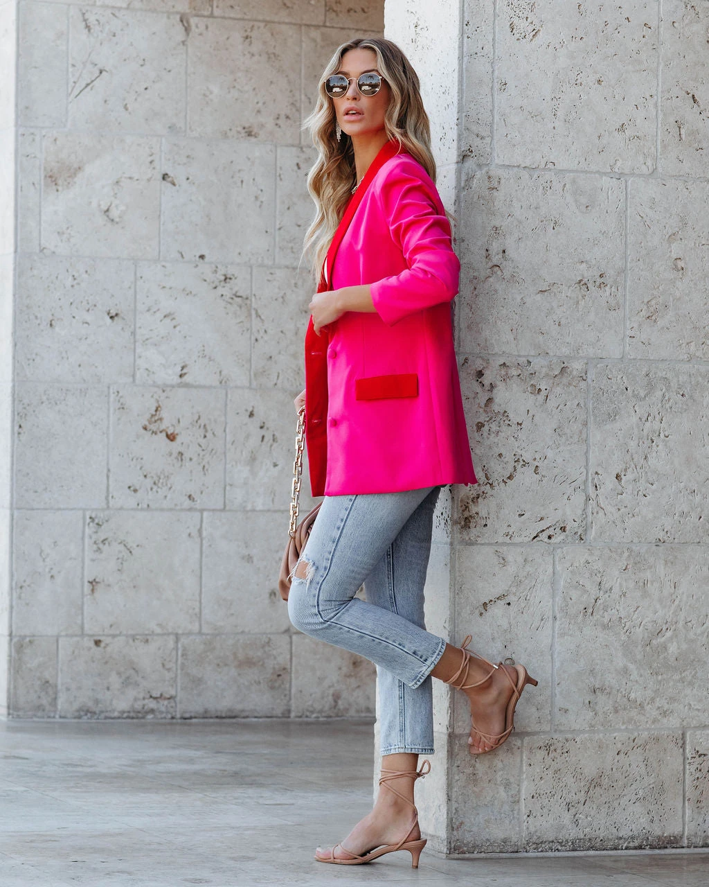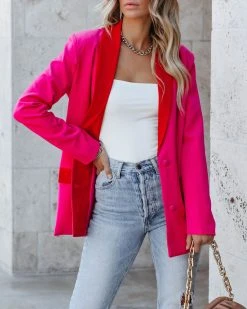 Put your best foot forward in the Love Notes Pocketed Colorblock Blazer with converging red and fuchsia hues and chic padded shoulders.
