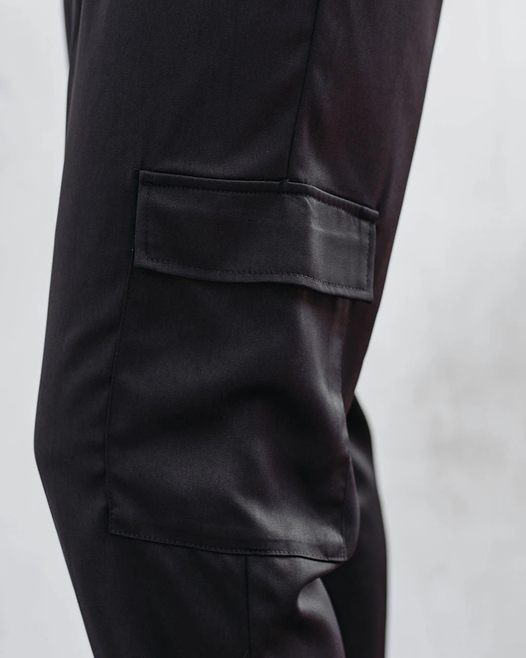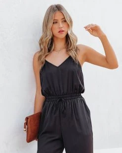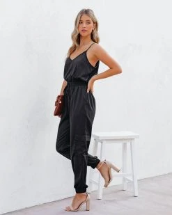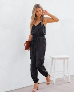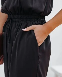 Youβll never want to take off the Quince Pocketed Satin Utility Jumpsuit in a luminous mineral black hue thatβs complete with a v-neckline.