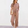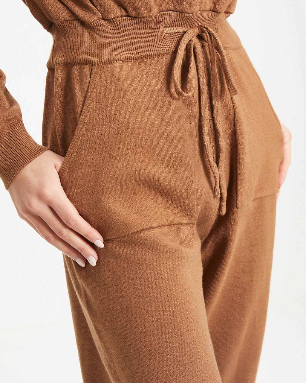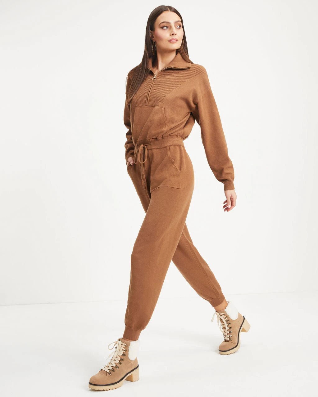 Comfy meets cool in the Ryker Pocketed Half Zip Knit Jumpsuit in camel that features a drawstring waistband.