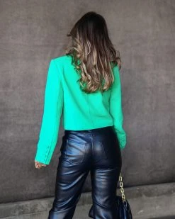 Chic meets sophisticated in the Thersa Crop Blazer in emerald that features a notched collar.