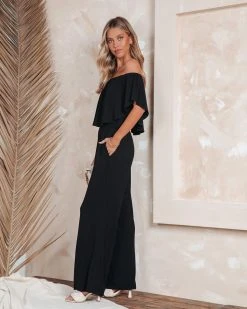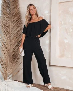 Comfy meets cute in the Antonella Off The Shoulder Pocketed Jumpsuit in black that features a relaxed fit.
