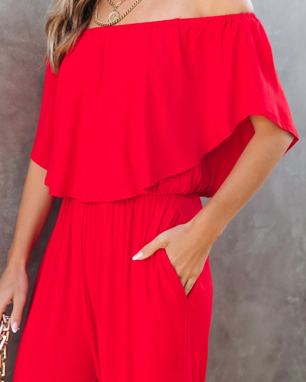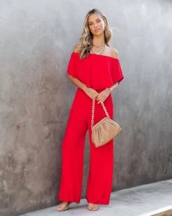 Comfy meets cute in the Antonella Off The Shoulder Pocketed Jumpsuit in red that features a relaxed fit. Â