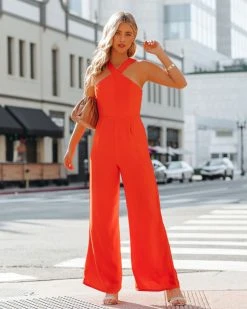 Cris cross details add an extra touch of chic! Our Decide The Vibe Jumpsuit in orange features a structured waistband. Designed with a wide pant leg and a criss cross neck. Secured with a back zipper closure. Styled with the Roxy Hoops, Simple Bangle Bracelet, Chic Crossbody Chain Pouch Bag, and Whimsy Heel.Β