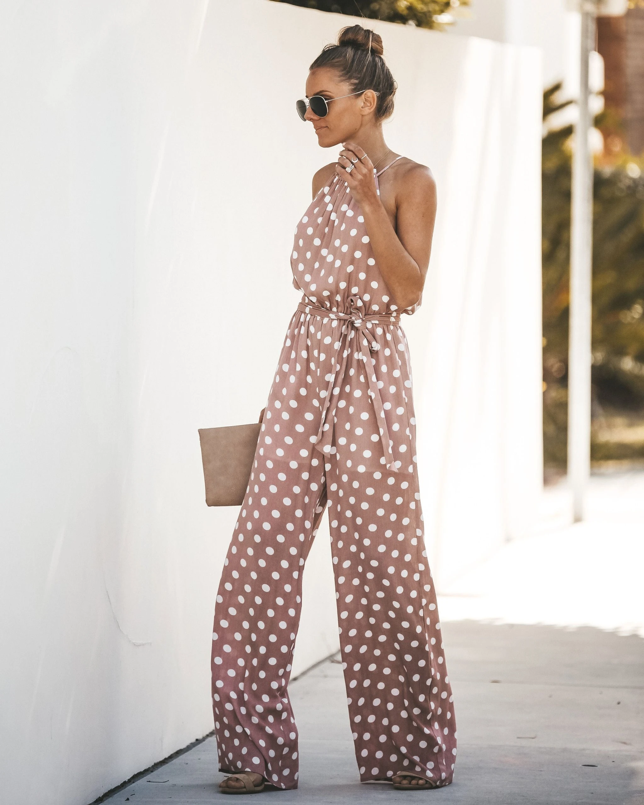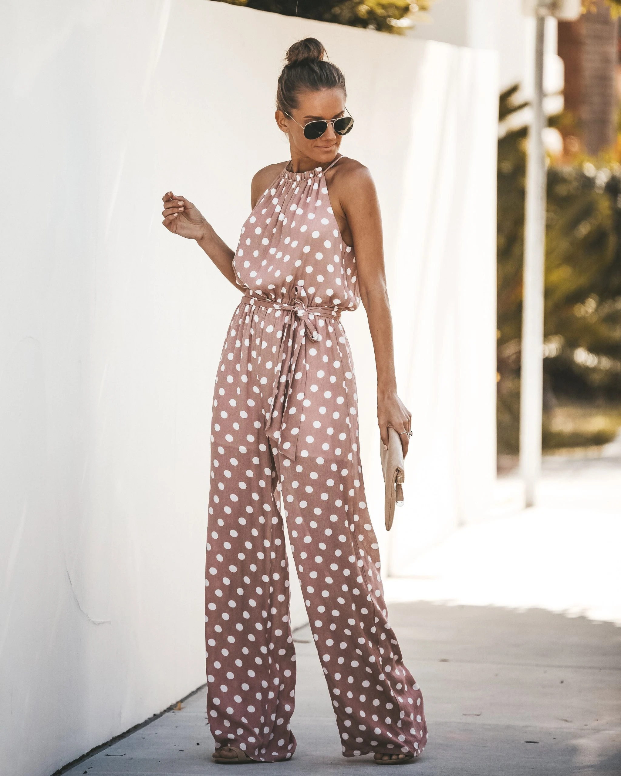 //Best Seller// Pretty Little Polka Dot Jumpsuit was made with you in mind. So cute with a mauve base and ivory polka dot print throughout.