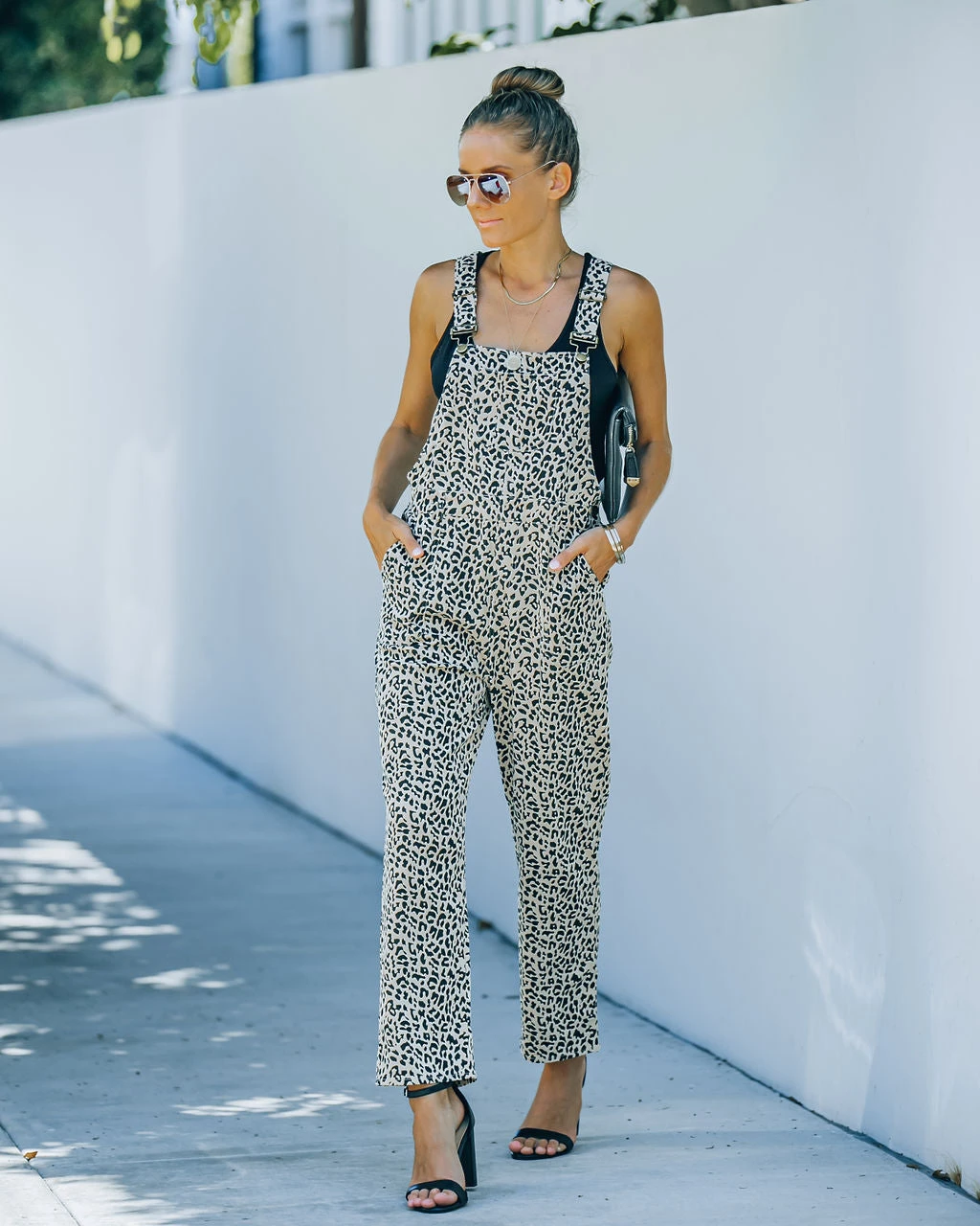 Major festival vibes in our Proud And Loud Cotton Cheetah Overalls! These sand and black cheetah printed overalls are detailed with a bib pocket, side pockets, and back pockets. Finished with adjustable buckles and a straight leg. Styled with the Minimal Herringbone Necklace, The Buddha Wheel Necklace, Simple Bangle Bracelet, Stella Crossbody Envelope Zip Clutch, Physique Racerback Tank, and Whimsy Heel.