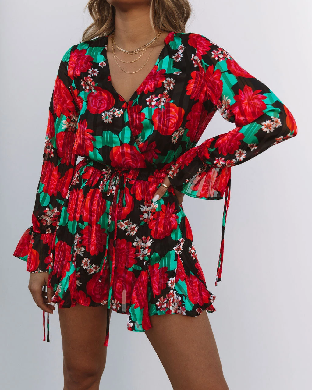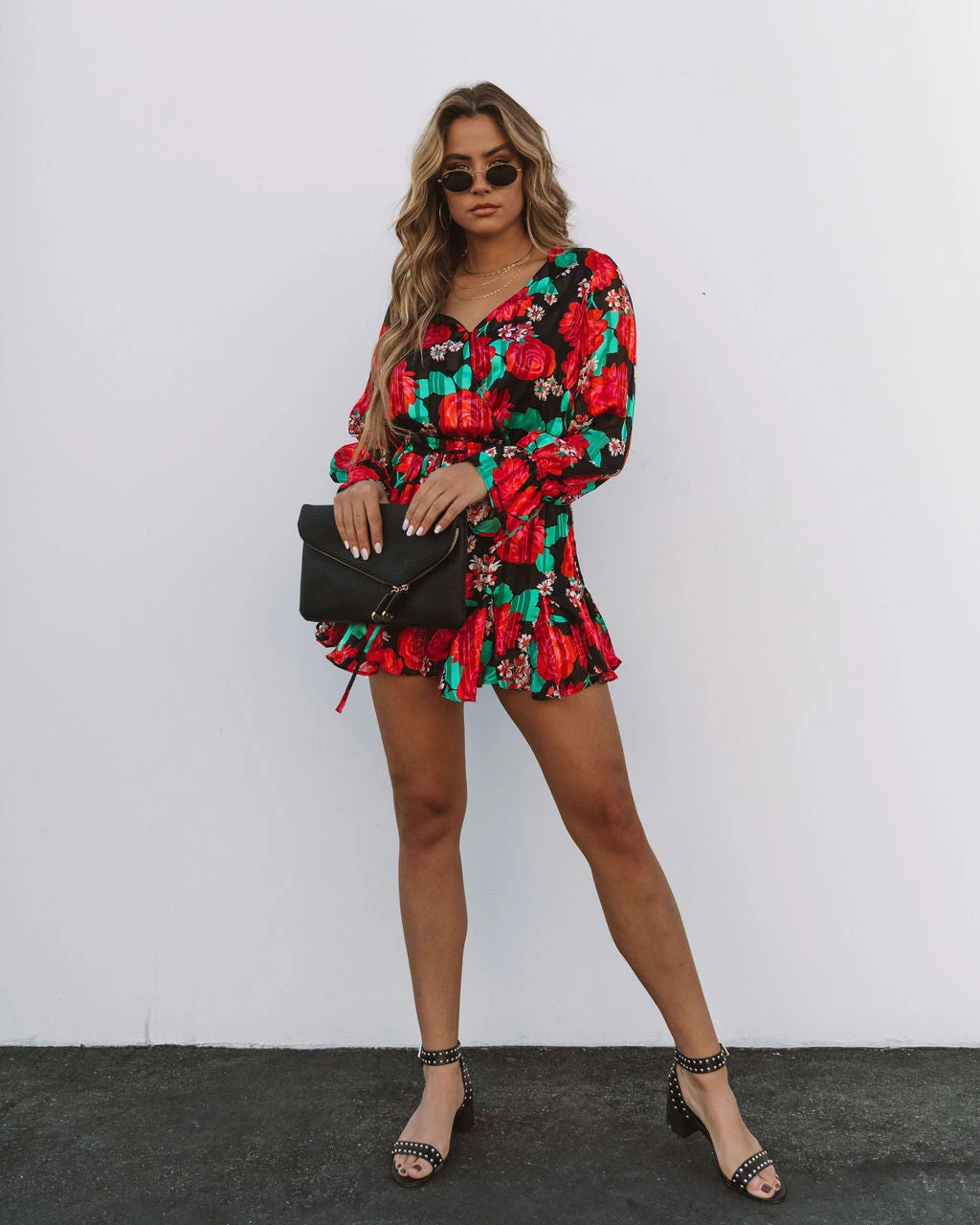 Our Rosebud Satin Ruffle Romper is so femme and fun! This black, red, green, white, and pink floral beauty is crafted with an elastic drawstring waistband. Designed with a ruffle hem and ruffle cuffs. Styled with the Perfect Hoop Earrings, Minimal Herringbone Necklace, Layers Of My Heart Necklace, Simple Bangle Bracelet, Stella Crossbody Envelope Zip Clutch, and Showtime Studded Heeled Sandal.