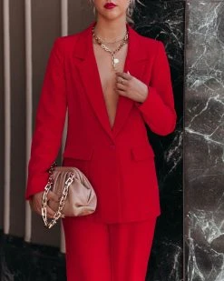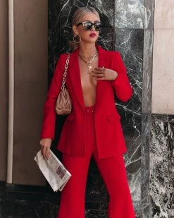 Matching suits deliver major boss babe energy! Our Runway Pocketed Blazer in red features padded shoulders for a sophisticated vibe. Designed with a lower back vent and front pockets. Styled with the Carson Black Frame Dark Smoke Polarized Sunglasses, Perfect Hoop Earrings, Compass Coin Necklace, Chloe Mini Necklace, Shayne Gold Link Necklace, Cameron Toggle Lariat, Simple Bangle Bracelet, Chic Crossbody Chain Pouch Bag, Runway Pocketed Belted Flare Trousers, and Whimsy Heel.Â