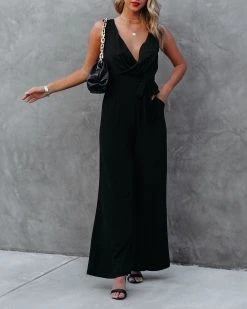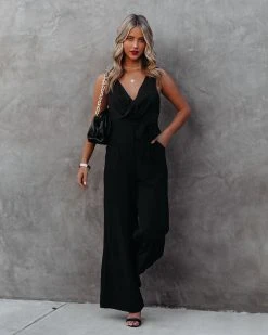 Our The Essential Pocketed Tie Jumpsuit is all in one fun! This black jumpsuit features a sultry draped neckline. Designed with a structured waistband and an adjustable waist tie closure. Styled with the Roxy Hoops, Elena Tennis Necklace, Shayne Gold Link Necklace, Compass Coin Necklace, Simple Bangle Bracelet, Chic Crossbody Chain Pouch Bag, and Whimsy Heel.