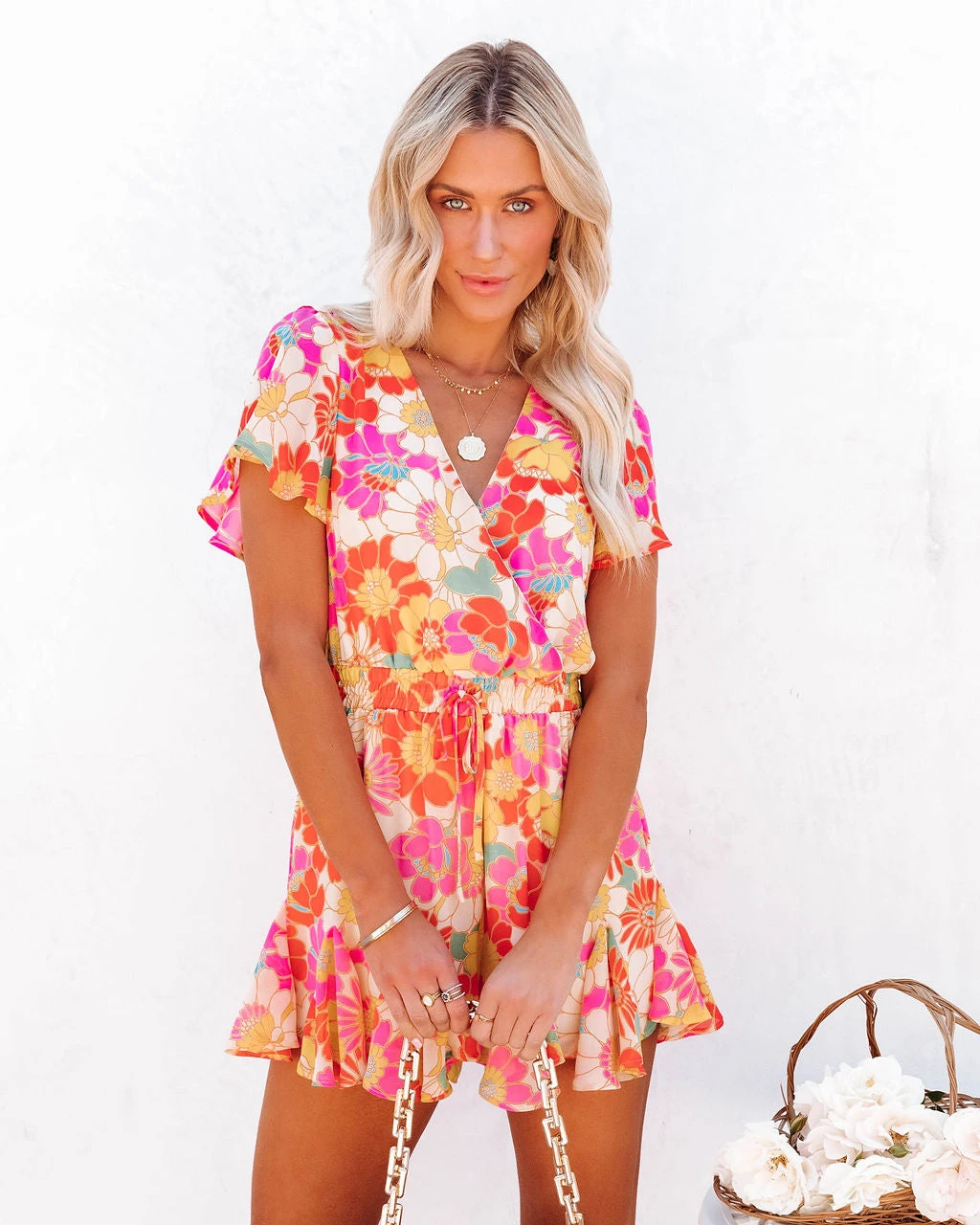 //Best Selling Silhouette//New Print// Give off happy vibes in the You Cute Floral Ruffle Romper in red, yellow, pink, blue, ivory, green, and peach that features a draped neckline.