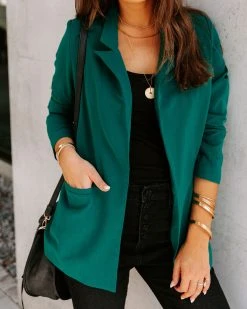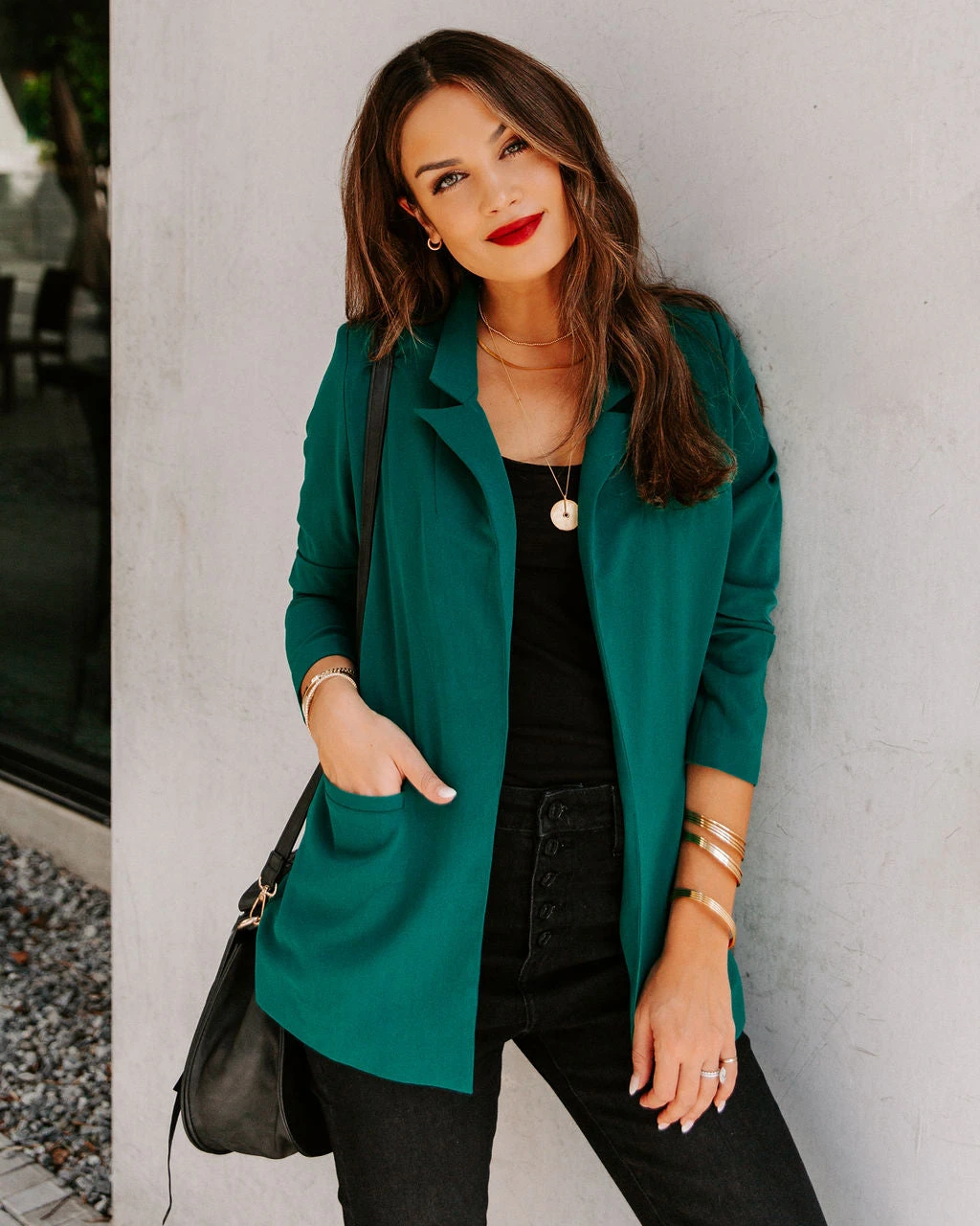 Add to your blazer collection in our Benley Pocketed Blazer! This hunter green hued blazer features padded shoulders and a notched collar. Finished with front slit pockets and a lower back vent. Styled with the Mercury Hoops, Minimal Herringbone Necklace, Weave Coin Necklace, Highland Bag, Simple Bangle Bracelet, Physique Racerback Tank, Keen High Rise Button Front Skinny, and Motorway Studded Heeled Chelsea Boot.