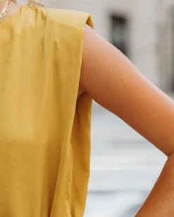 Boxy blouses are such a cool girl look! Our Times Square Padded Shoulder Blouse comes in mustard. Secured with a back button closure. This top is fully lined. Elevate this top with denim and booties! Styled with the Gabi Hoops, St. Benedict Coin Necklace, London Calling Necklace, Kaye Link Bracelet, Stella Crossbody Envelope Zip Clutch, Ultimate High Rise Split Ankle Distressed Skinny, and Ritz Faux Suede Pointed Heel.ย