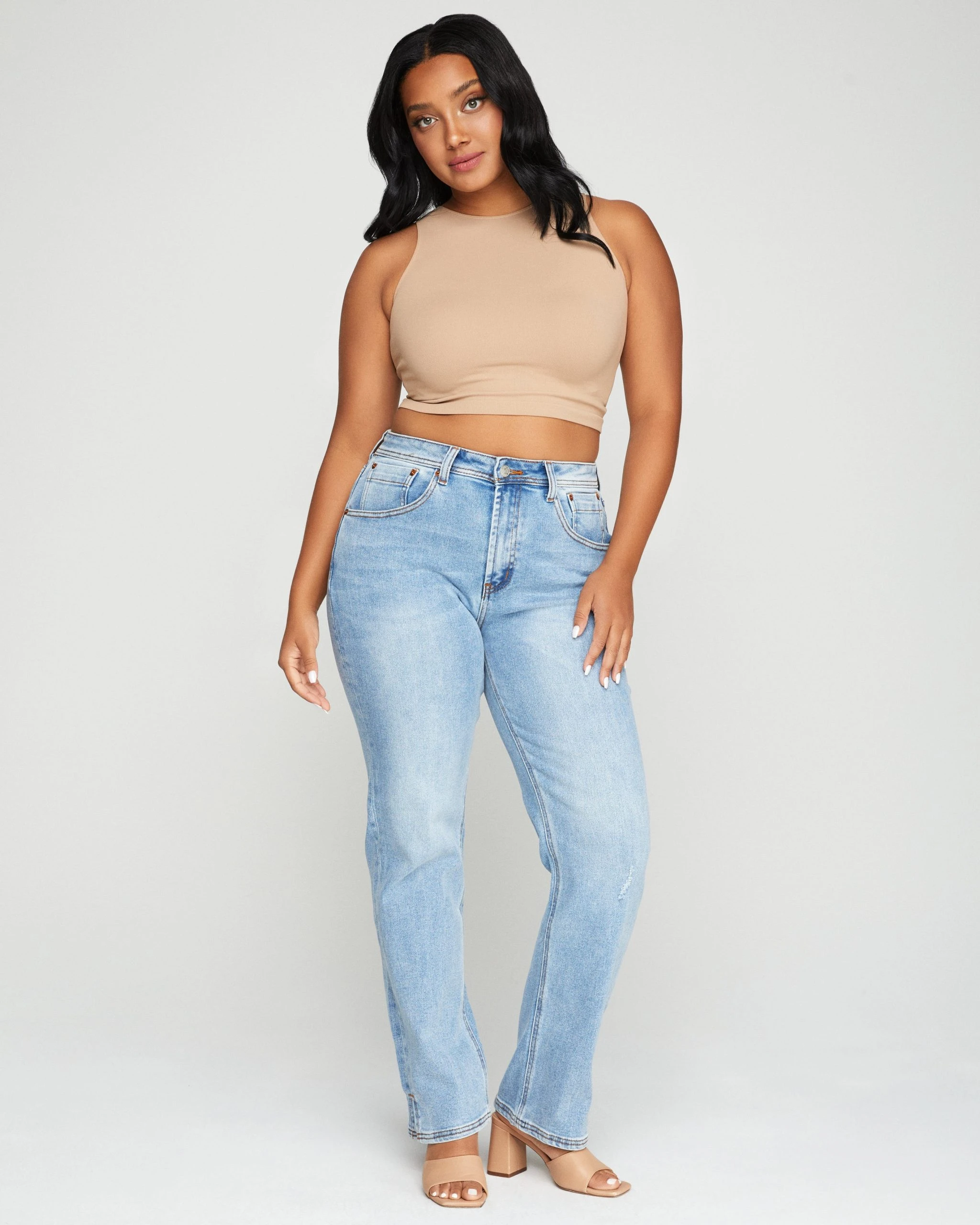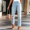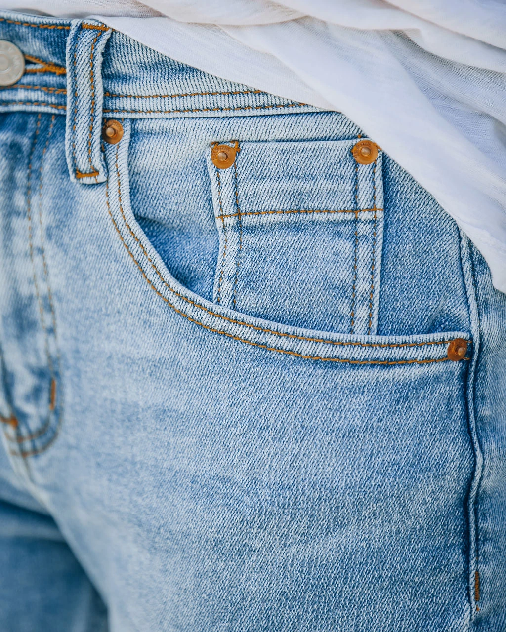 Perfect for everyday, the Merrick High Rise Slim Straight Denim in light indigo that features ankle slits.