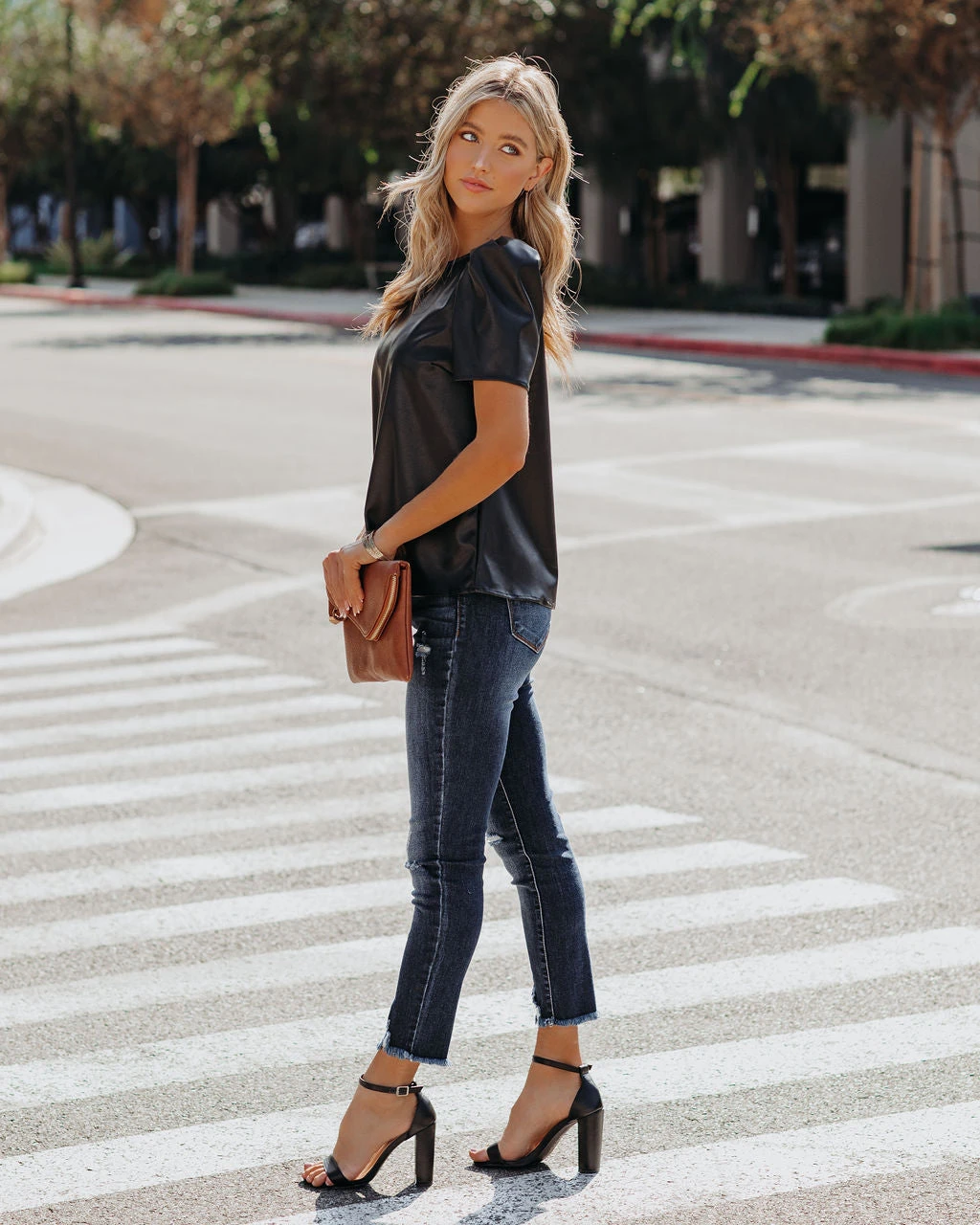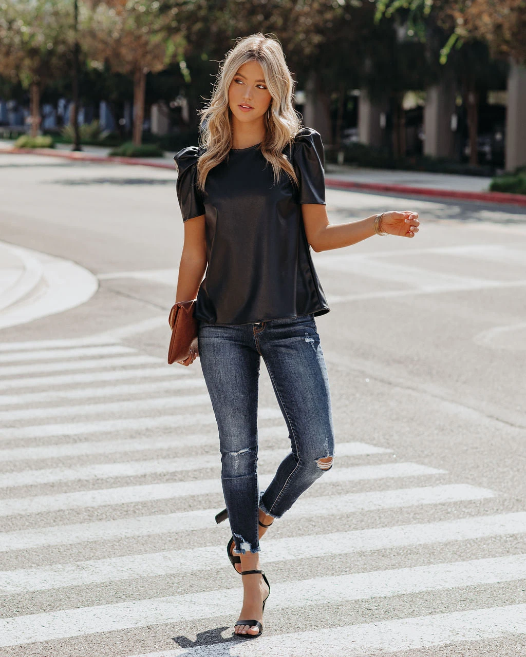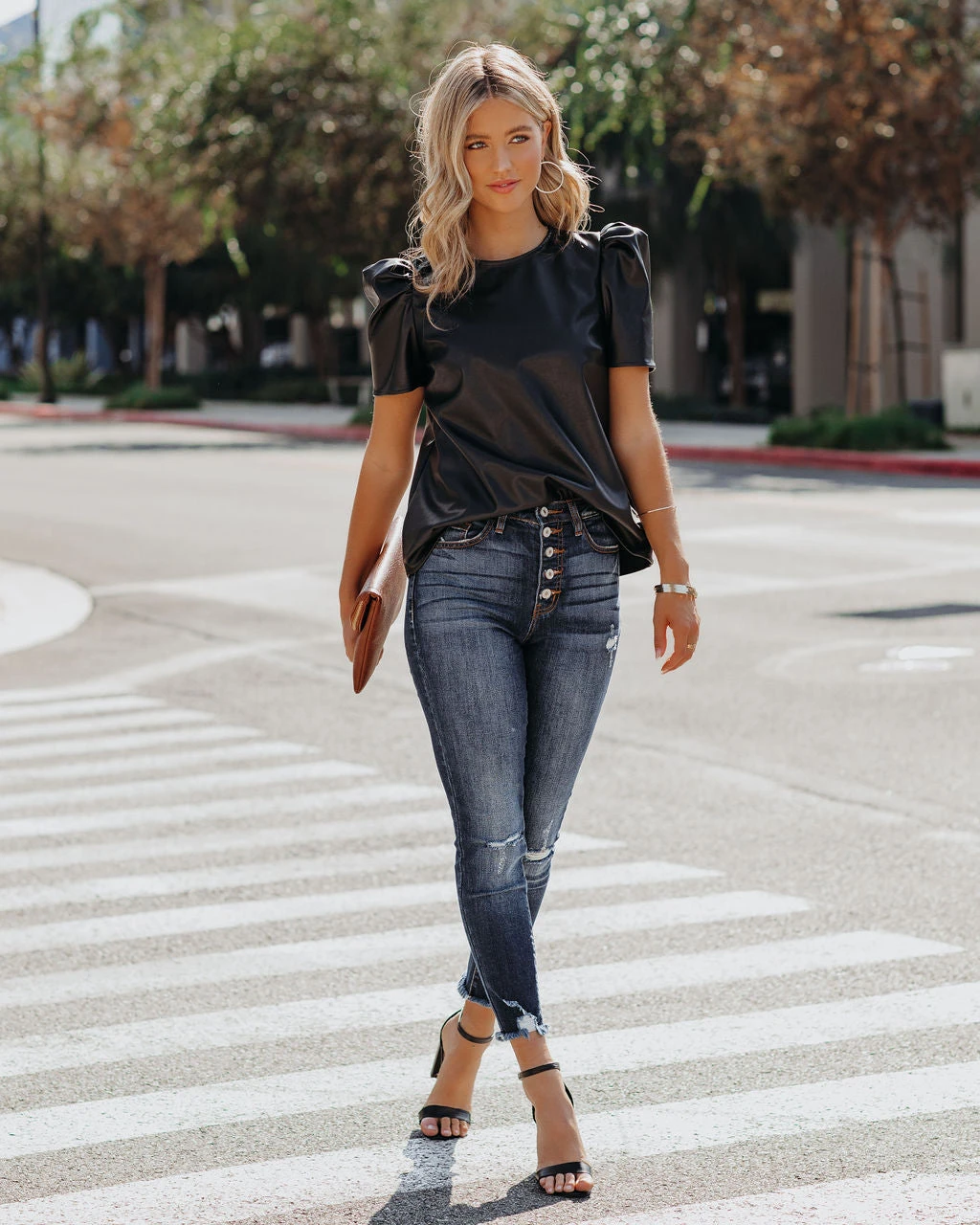 Keep it chic and sleek in our Benefit Puff Sleeve Faux Leather Top! This black faux leather top features puffy sleeves and a crew neckline. Secured with a back keyhole and a neckline button closure. Styled with the Perfect Hoop Earrings, Simple Bangle Bracelet, Chloe Mini Necklace, Stella Crossbody Envelope Zip Clutch, Tilley Frayed Ankle High Waisted Skinny, and Whimsy Heel.