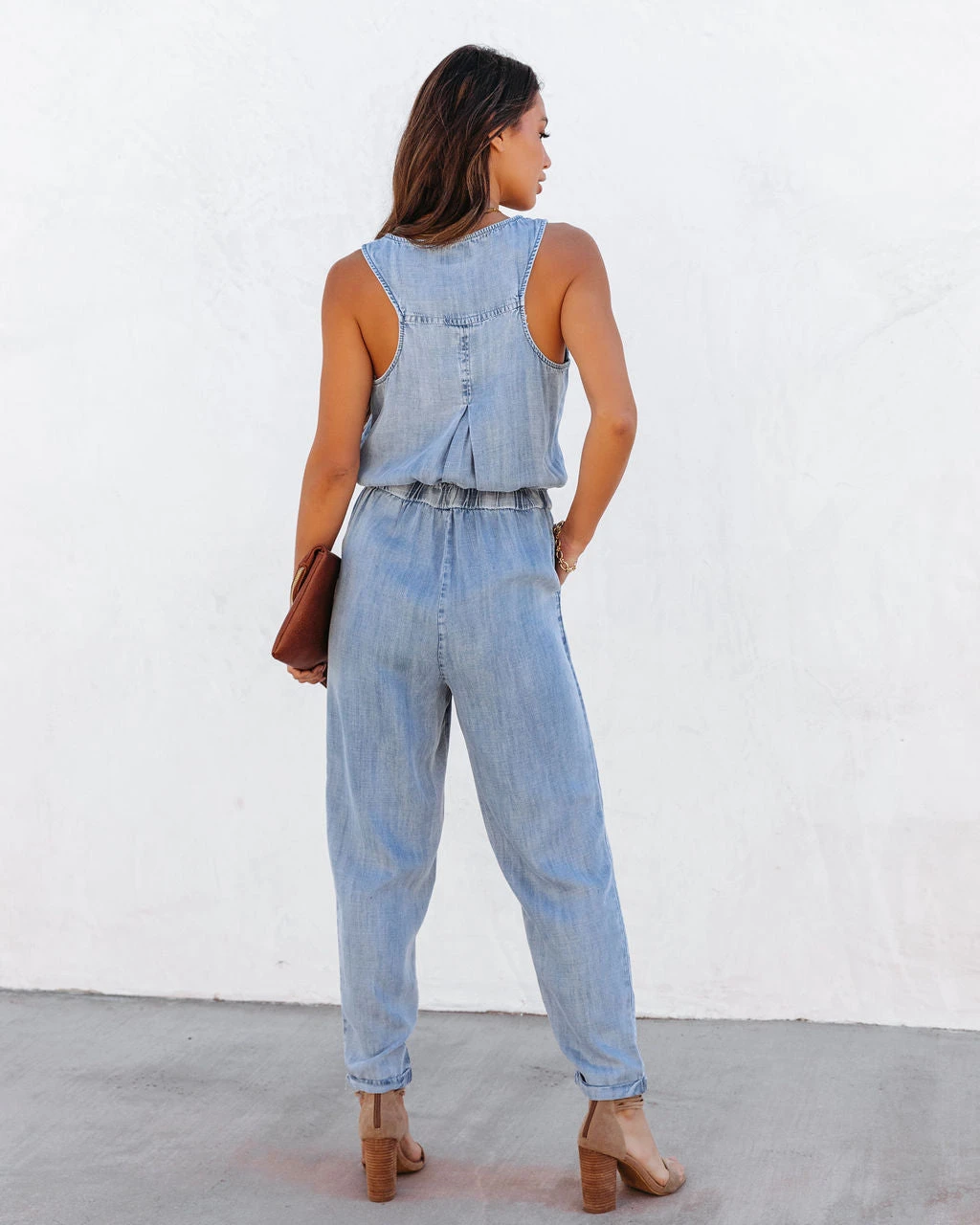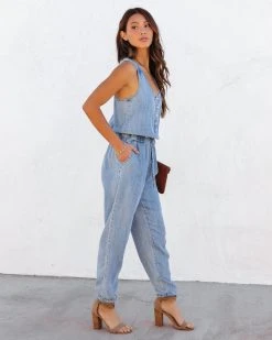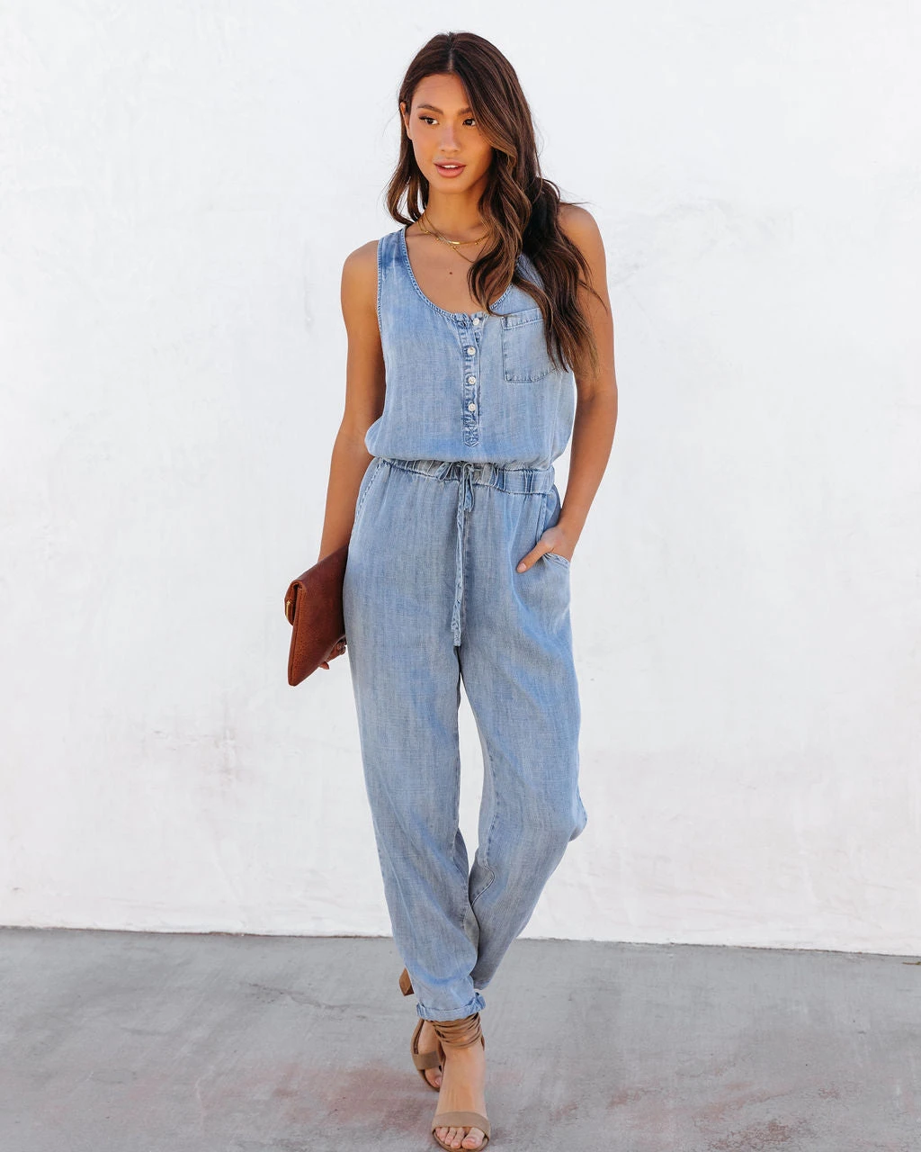 Major laid back vibes in the Courtney Tencel Pocketed Jumpsuit in medium wash that features a fitted waist.