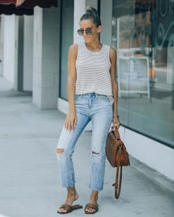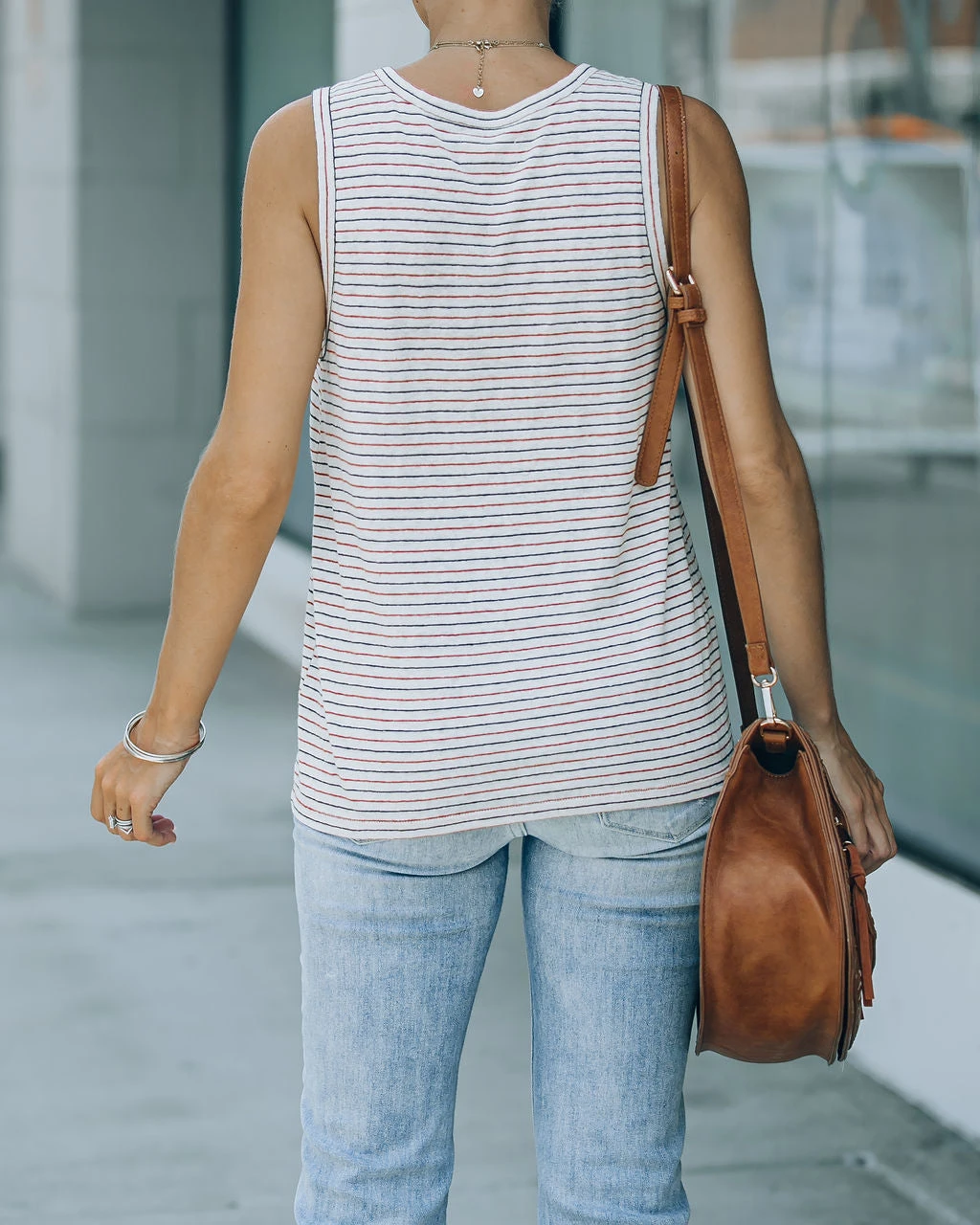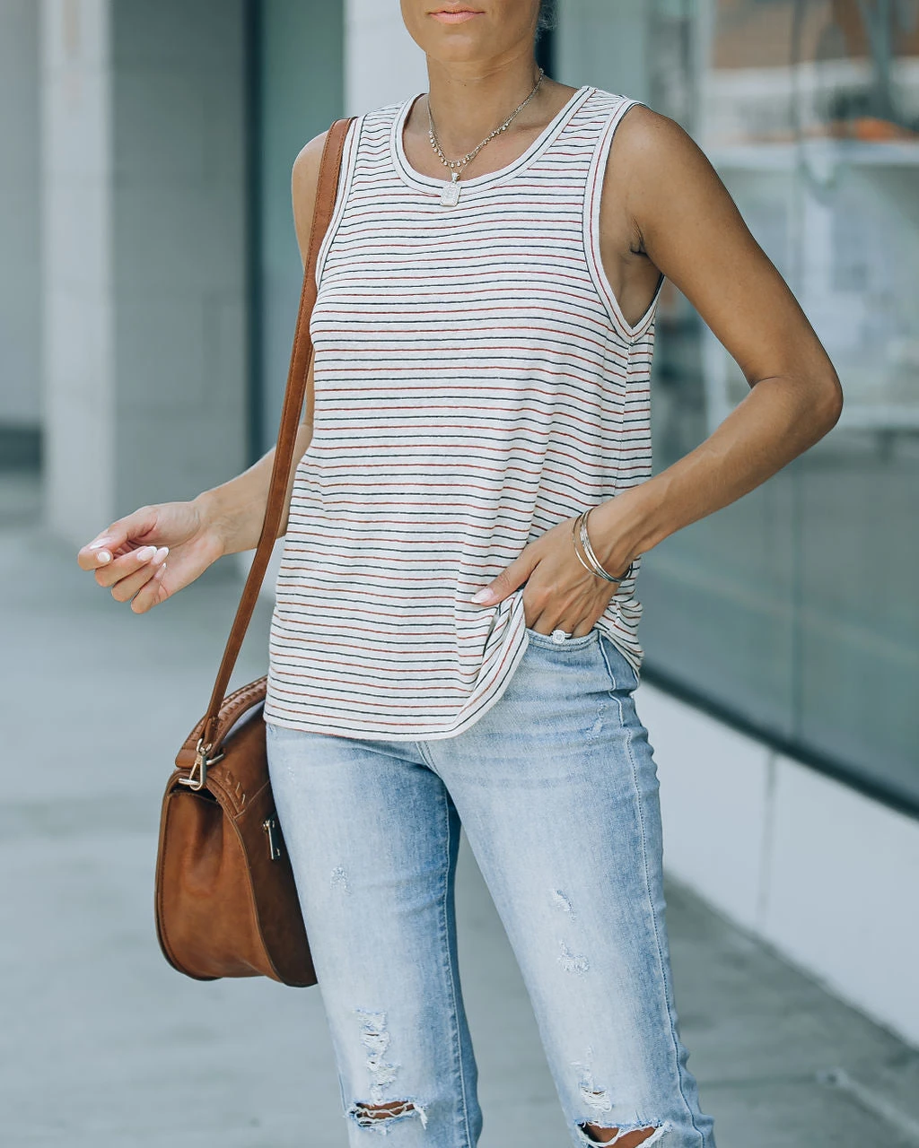 Celebrate easy weekends in the Logan Striped Linen Blend Tank in white and black that features a crew neckline.