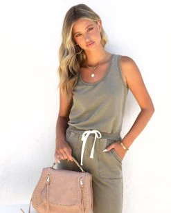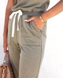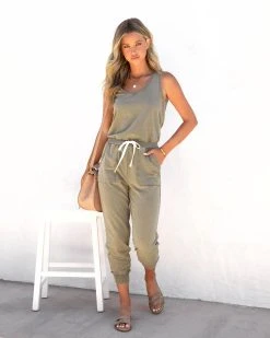 Comfort meets cuteness in the Placerville Pocketed Drawstring Jumpsuit in olive that features a drawstring waistband.