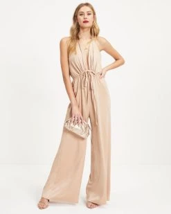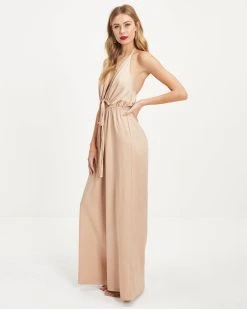 Look like a goddess in the Chelsea Satin Halter Cutout Jumpsuit in tan that features a plunging neckline.
