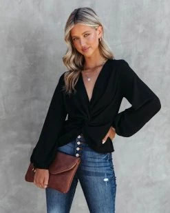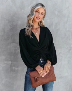 Meet your gals for drinks in the City Dreams Twisted Drape Top in black that features a draped neckline.