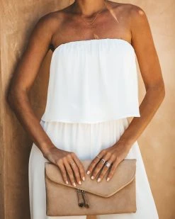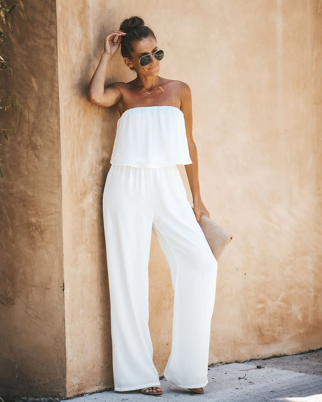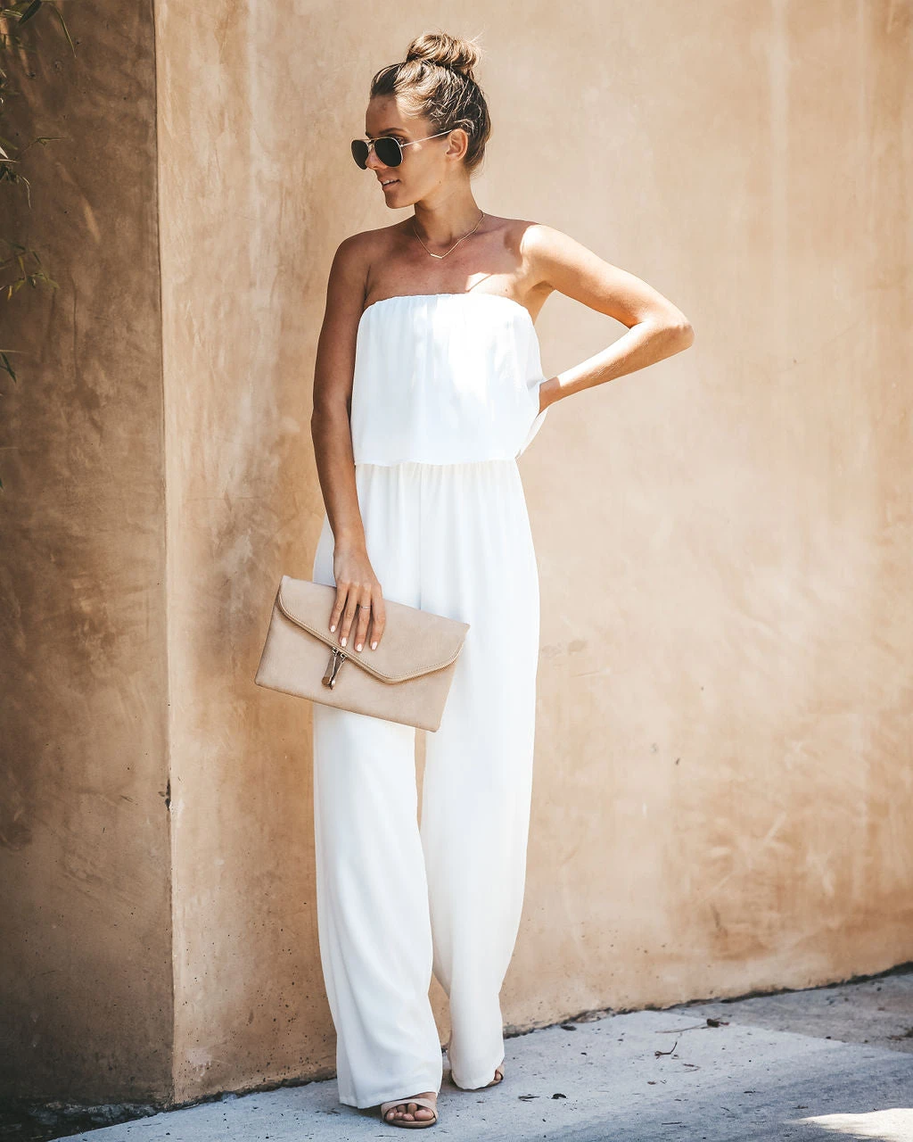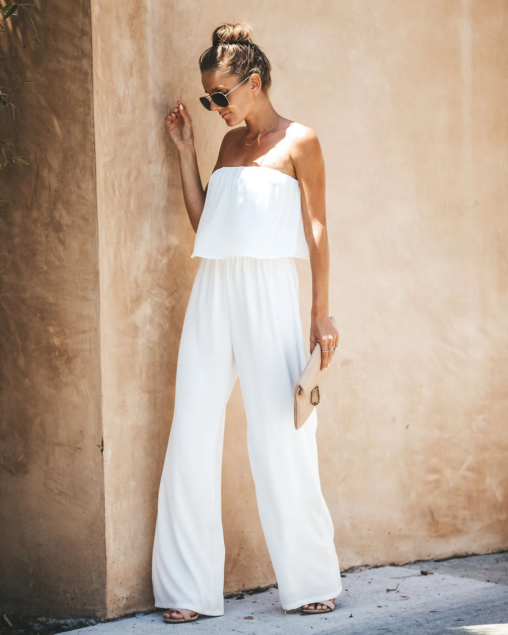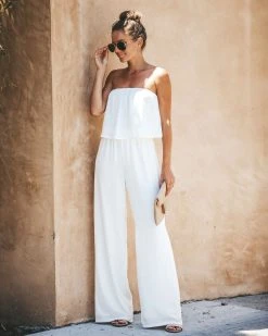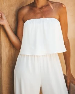 //Best Seller// The Crystal Clear Strapless Jumpsuit is fit with an elastic strapless neckline and designed in a white crepey fabrication for a more textured look.