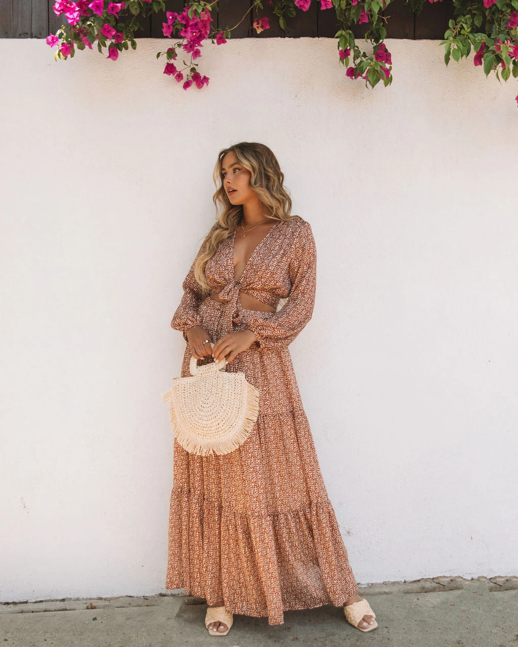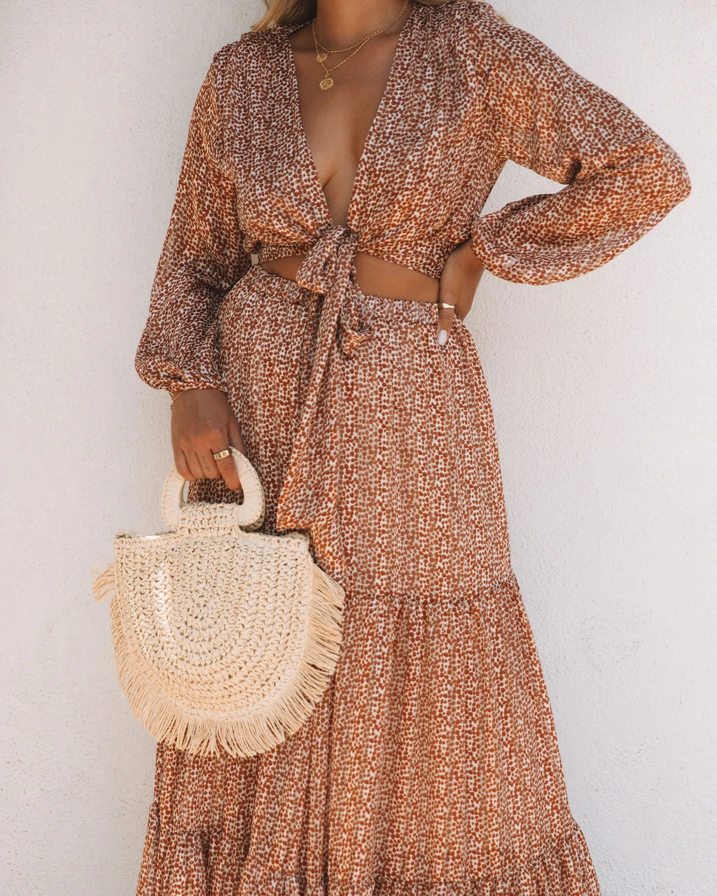 //Best Seller// Introducing your dinner ready fit! Our Scenery Printed Tie Front Crop Blouse pairs flawlessly with the matching skirt and heeled sandals. This navy and white plunging top features shimmer gold threads throughout.