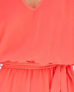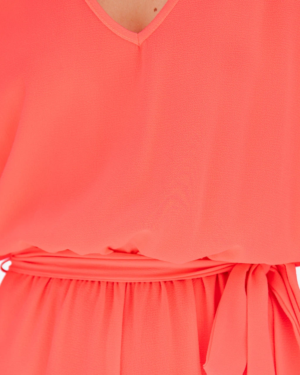//Best Seller//New Color// Turn heads everywhere you go in this gorgeous bright coral romper! Our Spring Scene Pocketed Tie Romper is a relaxed fit with a v-neckline and an adjustable waist tie.