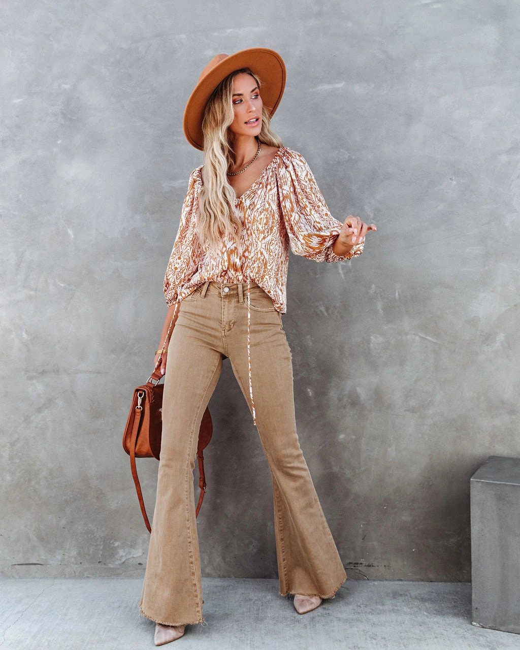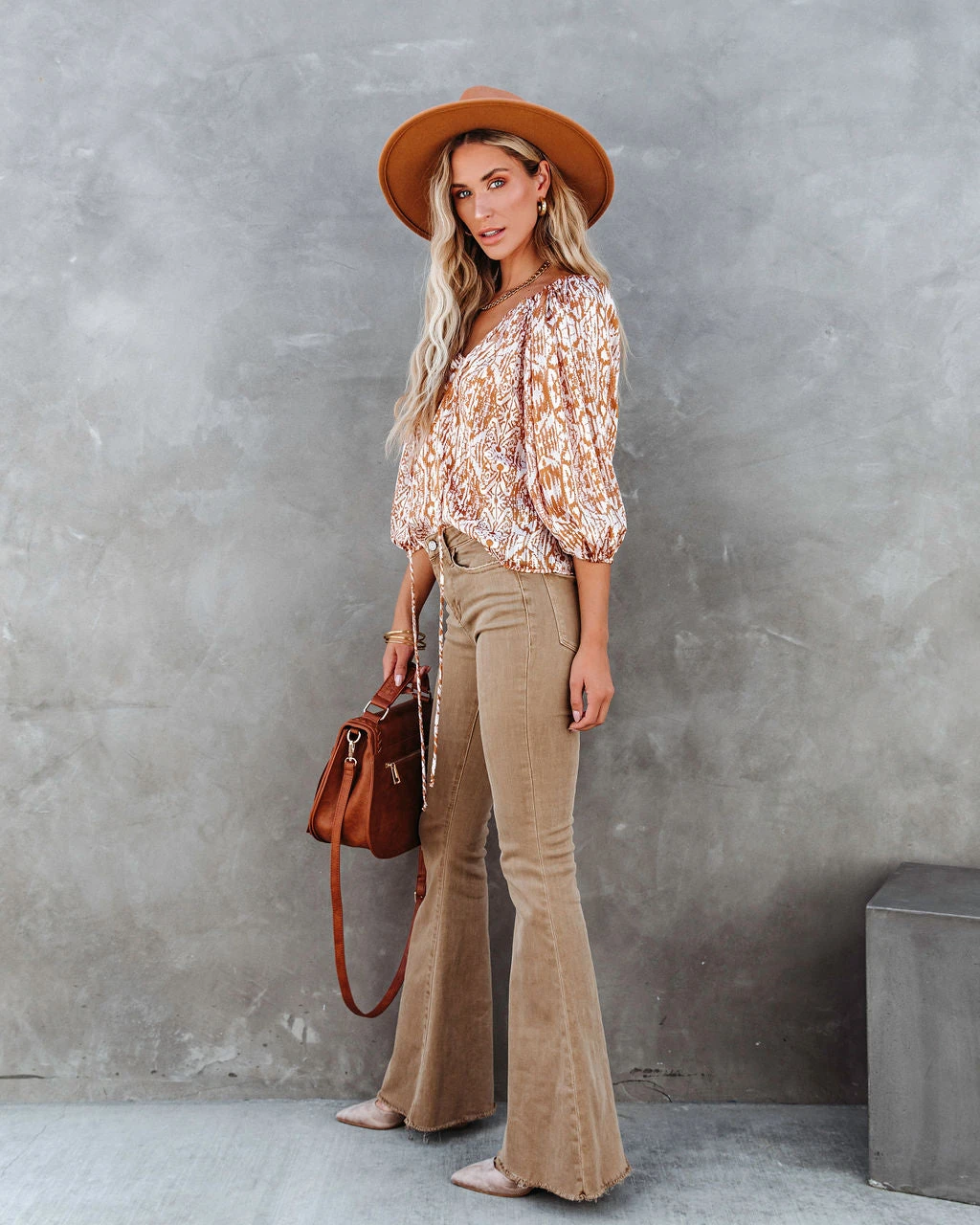 Go from work to drinks in the Wynonna Printed Lightweight Blouse in caramel that features an elastic neckline.