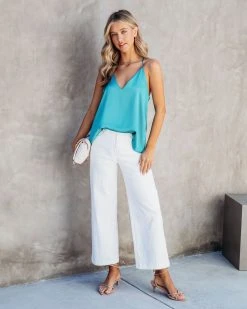 Classic meets cute in the Zaye Satin Tank in teal that features a v-neckline.