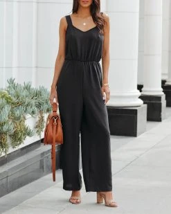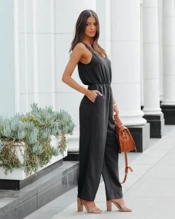 //Best Seller//New Color// Stroll around town in comfort in the black Brenna Pocketed Jumpsuit thatβs detailed with a rounded v-neckline and wide pant legs.