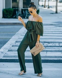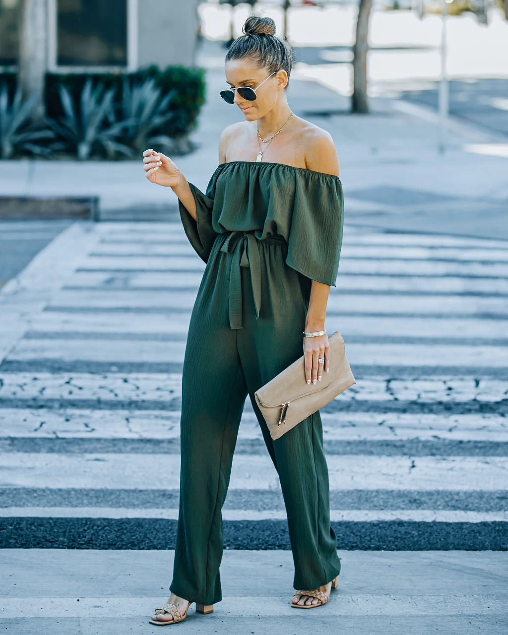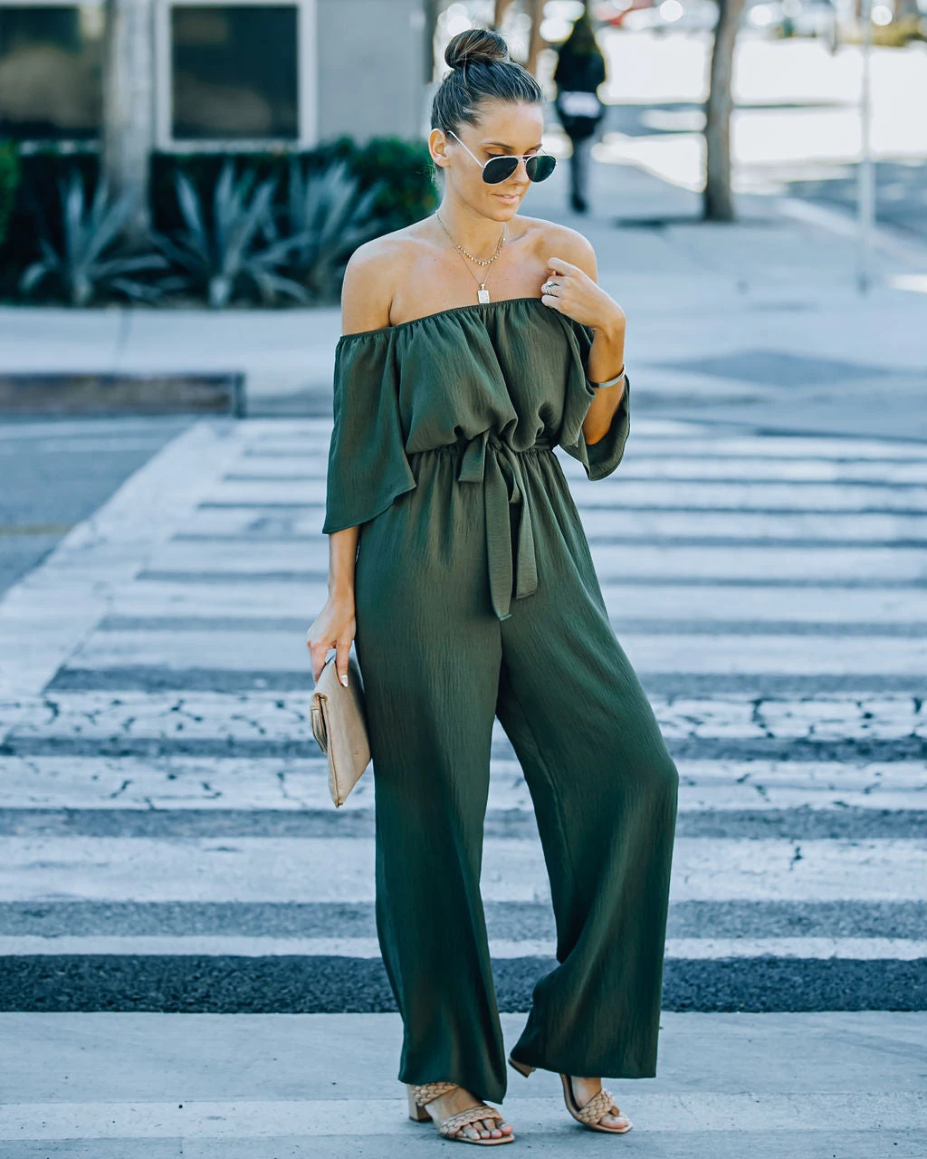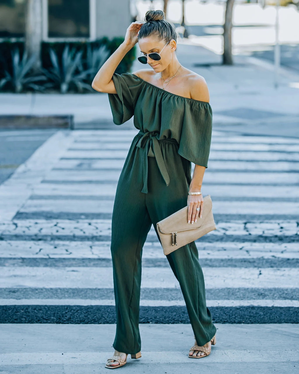 Our Leiland Off The Shoulder Jumpsuit is uber comfortable! This olive colored jumpsuit features a billowy fit. Designed with an adjustable waist tie and a wide pant leg. Finished with an elastic waistband. Styled with theΒ Chloe Mini Necklace, Initial Card Necklace, Simple Bangle Bracelet, Stella Crossbody Envelope Zip Clutch, and Luci Braided Heeled Sandal.Β