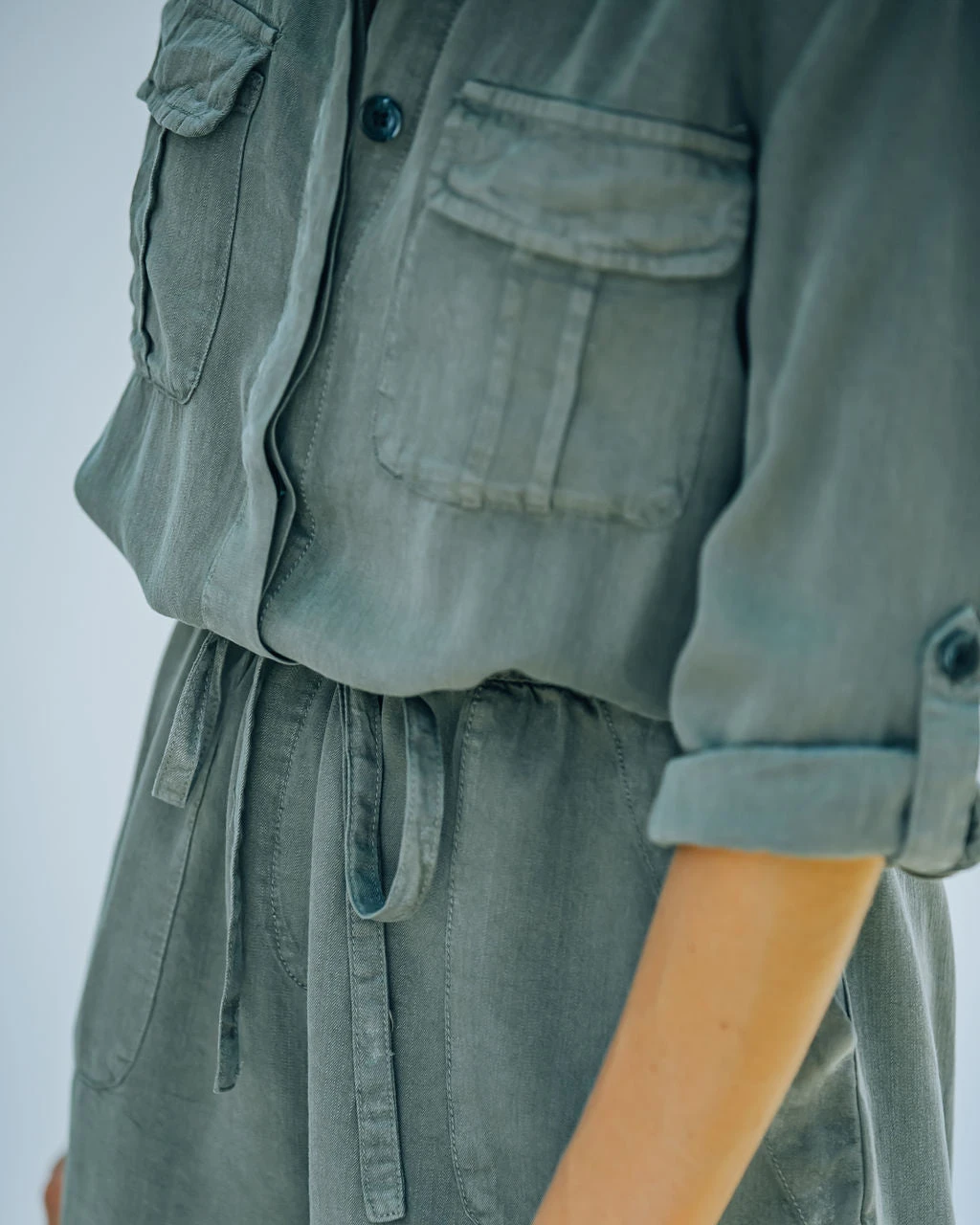 //Best Seller// New Color// Our Kamala Tencel Pocketed Utility Romper is a trend-forward, utility piece! Featuring a collared neckline, roll tab sleeves and concealed button down front. Designed with a washed black, relaxed fabrication that includes flap pockets, side pockets and button tab shoulders. Complete with an adjustable drawstring waist. Styled with the Chloe Mini Necklace, Judah Pendant Disc Necklace, Simple Bangle Bracelet, Stella Crossbody Envelope Zip Clutch, and Whimsy Heel.