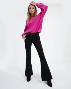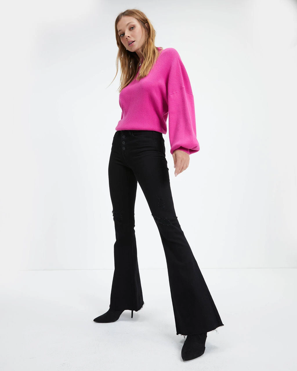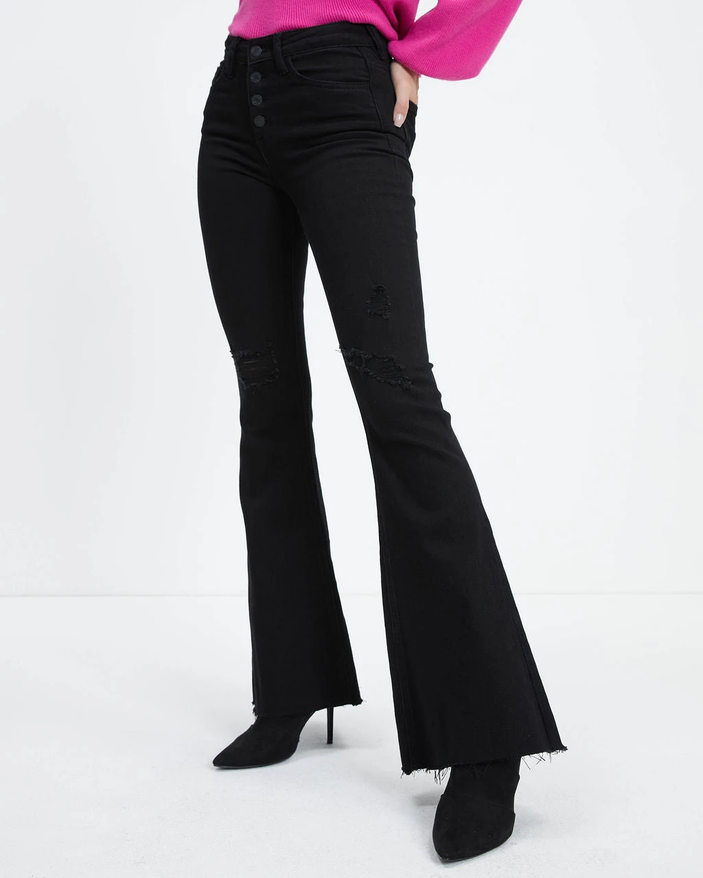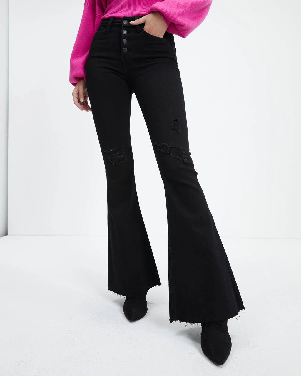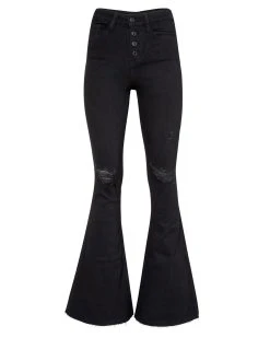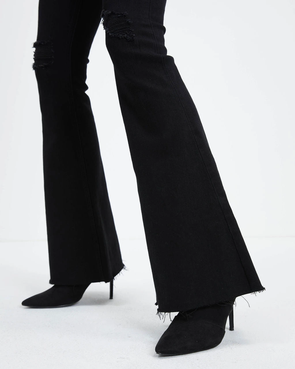 Go for a retro vibe in the Aden High Rise Distressed Flare Denim in black that feature a high rise waist.