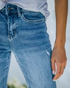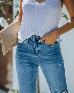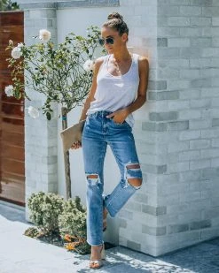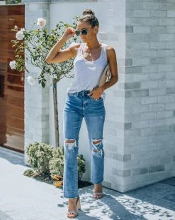 //VERVET Denim// Our Character High Rise Distressed Straight Denim are the perfect pair to your favorite classic white tee! These medium wash jeans have a high rise fit and a straight leg. Finished with distressing and a front fly and zipper closure. These jeans have stretch! Styled with the Daya Links Choker, Compass Coin Necklace, Stella Crossbody Envelope Zip Clutch, Physique Racerback Tank, and Whimsy Heel.
