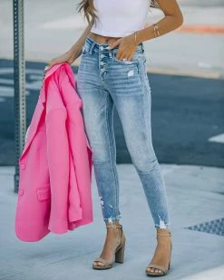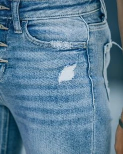 Cute for everyday, the Gerry High Rise Distressed Skinny in medium wash feature a light distressing and a high rise.