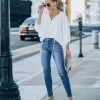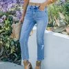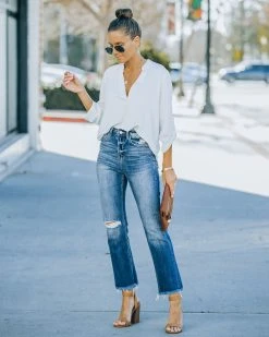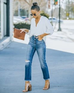 Our Kourt High Rise Straight Leg Denim are uber cool! These dark wash jeans feature a distressed knee. Designed with a frayed hemline and a straight leg. Styled with the Chloe Mini Necklace, Initial Card Necklace, Simple Bangle Bracelet, Stella Crossbody Envelope Zip Clutch, Split The Tab Blouse, and Chandler Block Heeled Sandal.